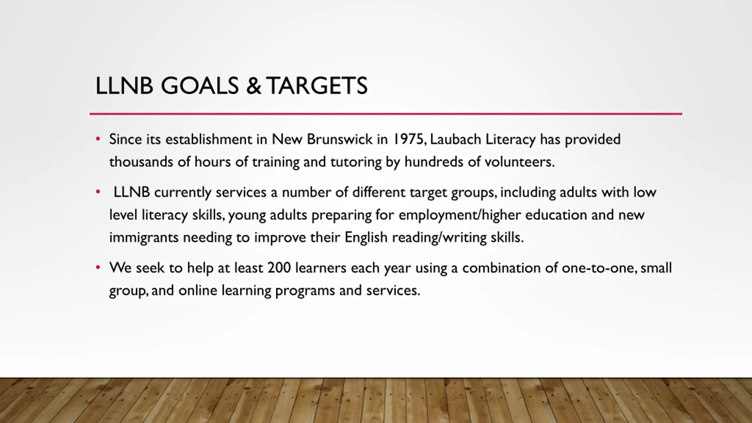 LLNB GOALS & TARGETS Since its establishment in New Brunswick in 1975, Laubach Literacy has provided thousands of hours of training and tutoring by hundreds of volunteers. LLNB currently services a number of different target groups, including adults with low level literacy skills, young adults preparing for employment/higher education and new immigrants needing to improve their English reading/writing skills. We seek to help at least 200 learners each year using a combination of one-to-one, small group, and online learning programs and services.
