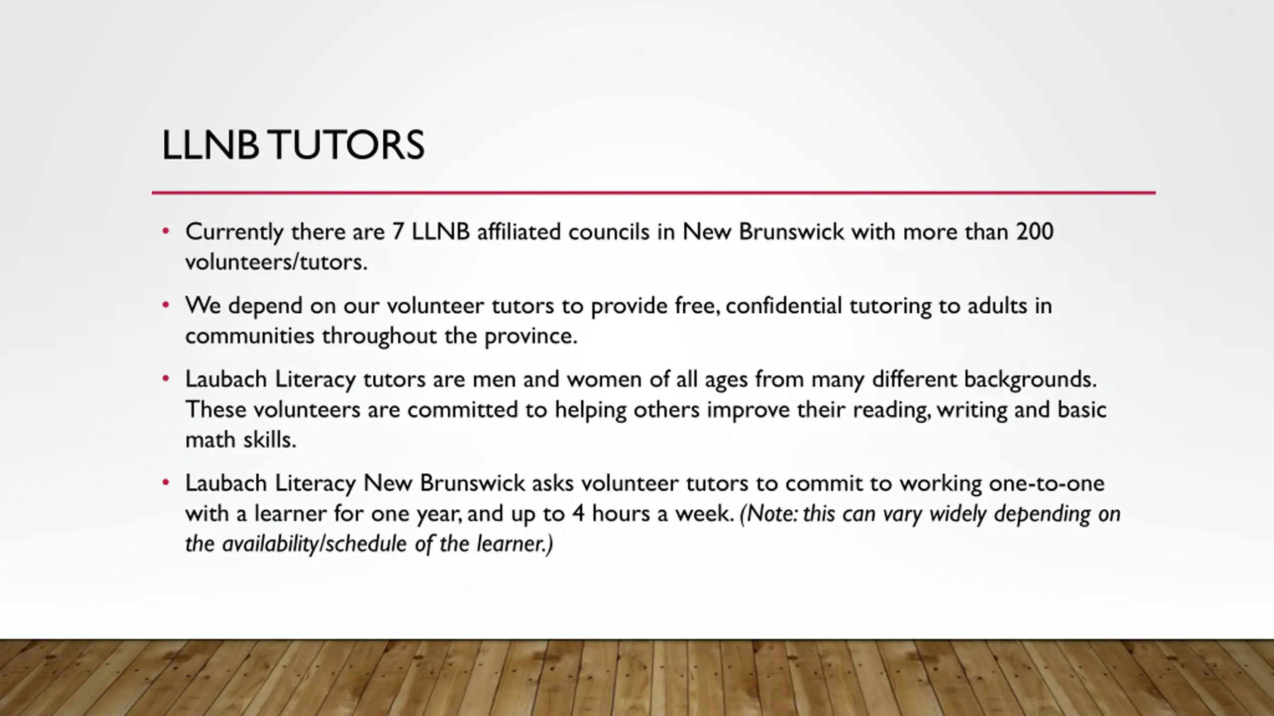 LLNB TUTORS Currently there are 7 LLNB affiliated councils in New Brunswick with more than 200 volunteers/tutors. We depend on our volunteer tutors to provide free, confidential tutoring to adults in communities throughout the province. Laubach Literacy tutors are men and women of all ages from many different backgrounds. These volunteers are committed to helping others improve their reading, writing and basic math skills. Laubach Literacy New Brunswick asks volunteer tutors to commit to working one-to-one with a learner for one year, and up to 4 hours a week. (Note: this can vary widely depending on the availability/schedule of the learner.)