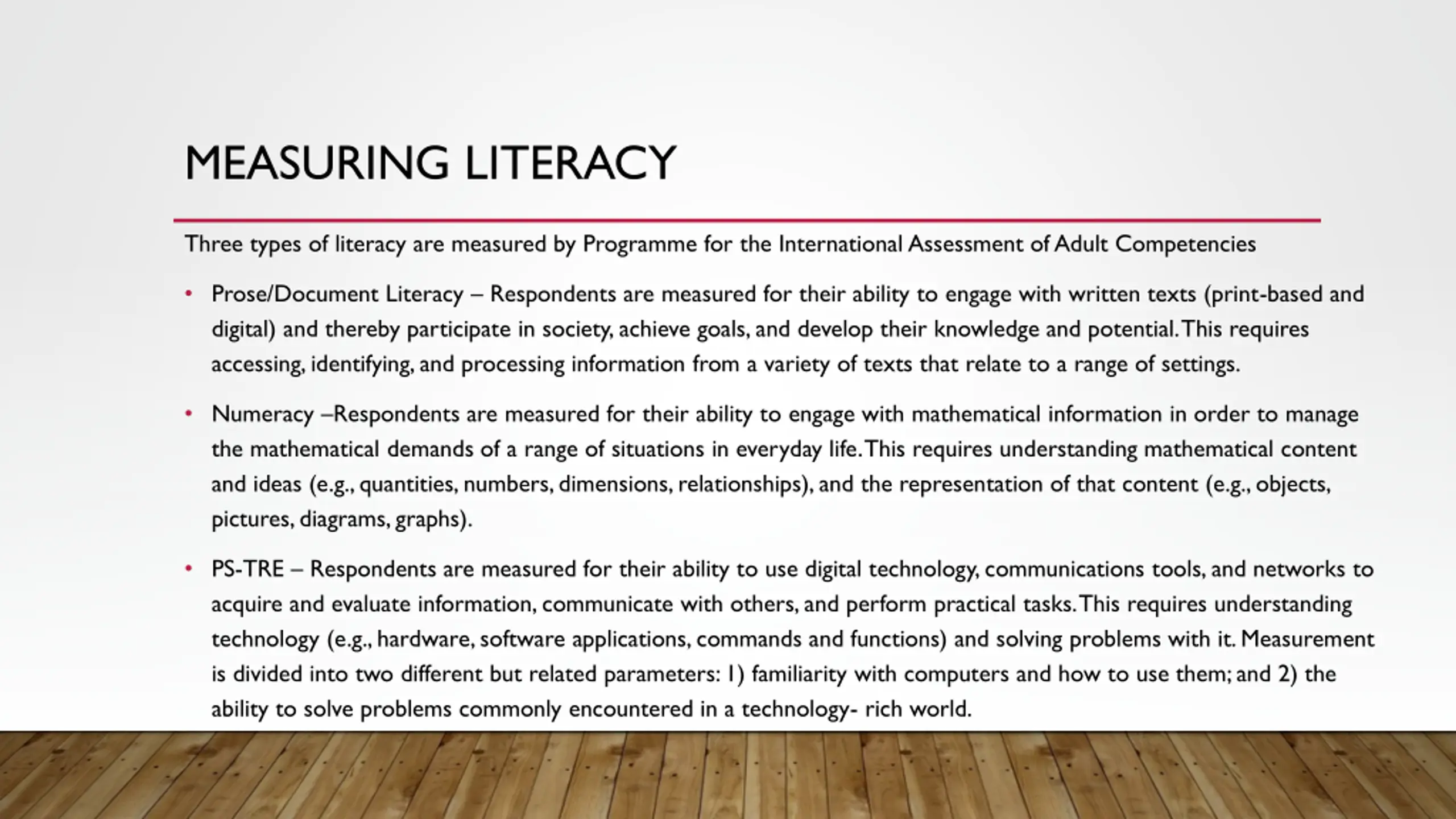 MEASURING LITERACY Three types of literacy are measured by Programme for the International Assessment of Adult Competencies Prose/Document Literacy Respondents are measured for their ability to engage with written texts (print-based and digital) and thereby participate in society, achieve goals, and develop their knowledge and potential. This requires accessing, identifying, and processing information from a variety of texts that relate to a range of settings. Numeracy Respondents are measured for their ability to engage with mathematical information in order to manage the mathematical demands of a range of situations in everyday life. This requires understanding mathematical content and ideas (e.g., quantities, numbers, dimensions, relationships), and the representation of that content (e.g., objects, pictures, diagrams, graphs). PS-TRE Respondents are measured for their ability to use digital technology, communications tools, and networks to acquire and evaluate information, communicate with others, and perform practical tasks. This requires understanding technology (e.g., hardware, software applications, commands and functions) and solving problems with it. Measurement is divided into two different but related parameters: 1) familiarity with computers and how to use them; and 2) the ability to solve problems commonly encountered in a technology- rich world.