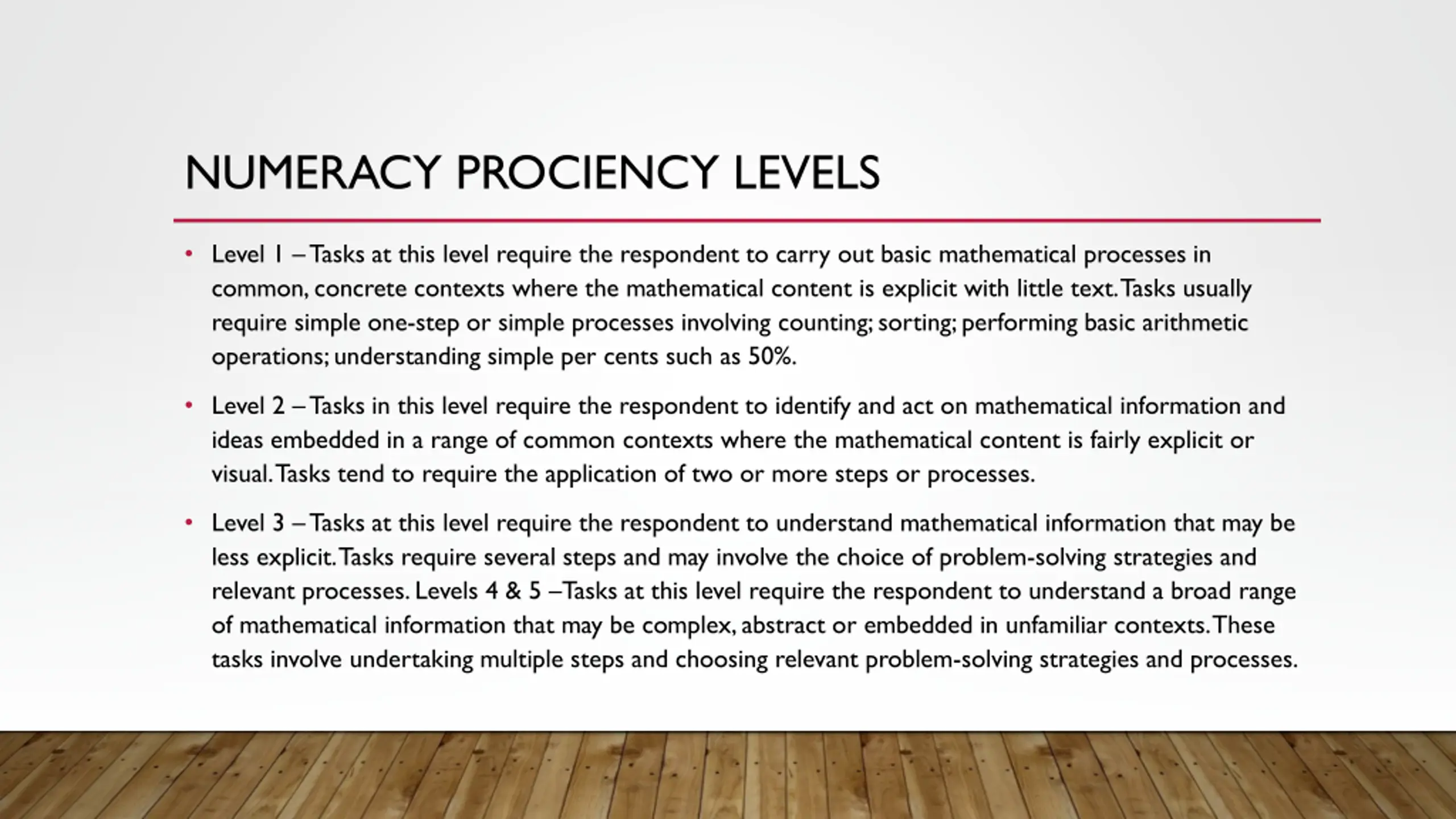 NUMERACY PROCIENCY LEVELS Level 1 Tasks at this level require the respondent to carry out basic mathematical processes in common, concrete contexts where the mathematical content is explicit with little text. Tasks usually require simple one-step or simple processes involving counting; sorting; performing basic arithmetic operations; understanding simple per cents such as 50%. Level 2 Tasks in this level require the respondent to identify and act on mathematical information and ideas embedded in a range of common contexts where the mathematical content is fairly explicit or visual. Tasks tend to require the application of two or more steps or processes. Level 3 Tasks at this level require the respondent to understand mathematical information that may be less explicit. Tasks require several steps and may involve the choice of problem-solving strategies and relevant processes. Levels 4 & 5 Tasks at this level require the respondent to understand a broad range of mathematical information that may be complex, abstract or embedded in unfamiliar contexts. These tasks involve undertaking multiple steps and choosing relevant problem-solving strategies and processes.
