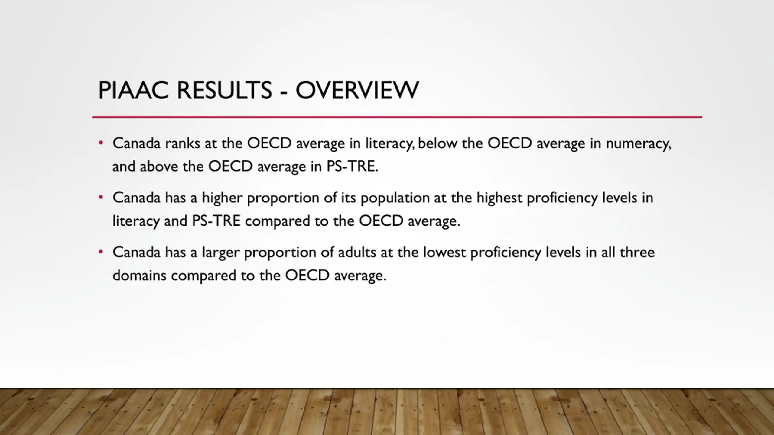 PIAAC RESULTS - OVERVIEW Canada ranks at the OECD average in literacy, below the OECD average in numeracy, and above the OECD average in PS-TRE. Canada has a higher proportion of its population at the highest proficiency levels in literacy and PS-TRE compared to the OECD average. Canada has a larger proportion of adults at the lowest proficiency levels in all three domains compared to the OECD average.