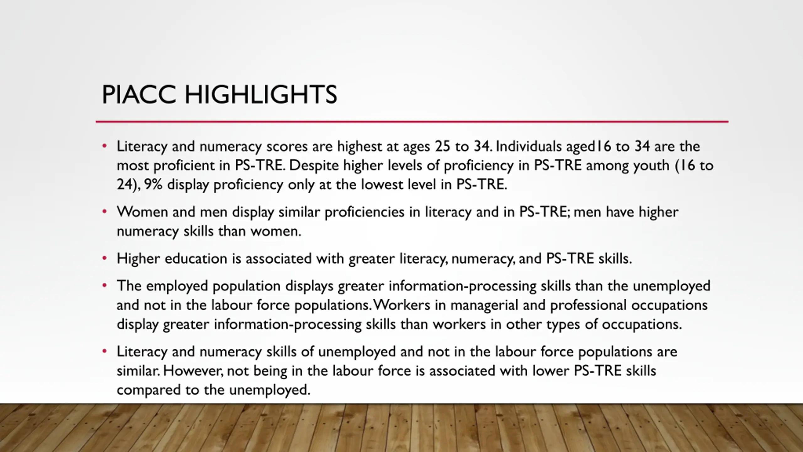 PIACC HIGHLIGHTS Literacy and numeracy scores are highest at ages 25 to 34. Individuals aged16 to 34 are the most proficient in PS-TRE. Despite higher levels of proficiency in PS-TRE among youth (16 to 24), 9% display proficiency only at the lowest level in PS-TRE. Women and men display similar proficiencies in literacy and in PS-TRE; men have higher numeracy skills than women. Higher education is associated with greater literacy, numeracy, and PS-TRE skills. The employed population displays greater information-processing skills than the unemployed and not in the labour force populations. Workers in managerial and professional occupations display greater information-processing skills than workers in other types of occupations. Literacy and numeracy skills of unemployed and not in the labour force populations are similar. However, not being in the labour force is associated with lower PS-TRE skills compared to the unemployed.