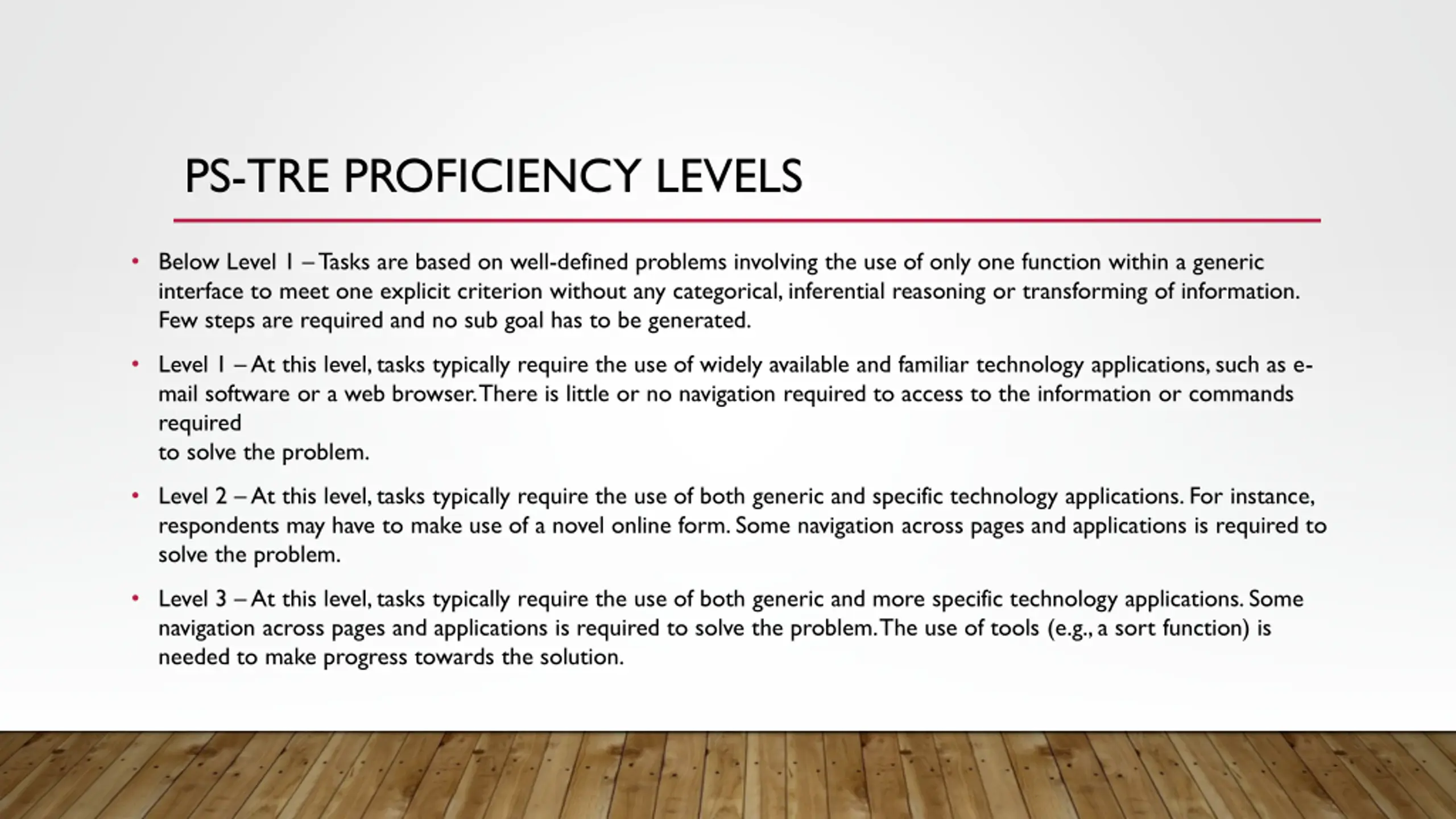 PS-TRE PROFICIENCY LEVELS Below Level 1 Tasks are based on well-defined problems involving the use of only one function within a generic interface to meet one explicit criterion without any categorical, inferential reasoning or transforming of information. Few steps are required and no sub goal has to be generated. Level 1 At this level, tasks typically require the use of widely available and familiar technology applications, such as e- mail software or a web browser. There is little or no navigation required to access to the information or commands required to solve the problem. Level 2 At this level, tasks typically require the use of both generic and specific technology applications. For instance, respondents may have to make use of a novel online form. Some navigation across pages and applications is required to solve the problem. Level 3 At this level, tasks typically require the use of both generic and more specific technology applications. Some navigation across pages and applications is required to solve the problem. The use of tools (e.g., a sort function) is needed to make progress towards the solution.