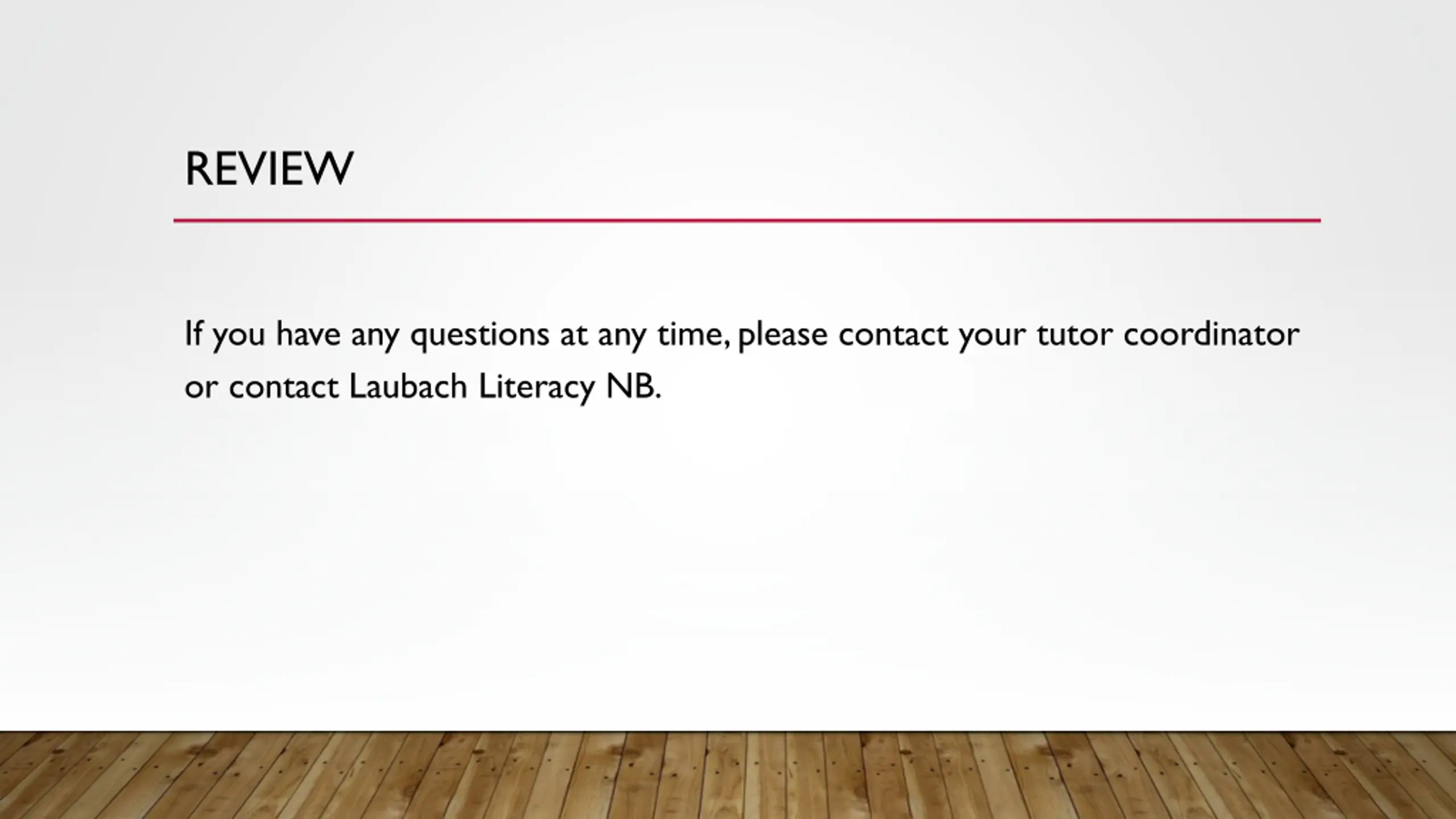 REVIEW If you have any questions at any time, please contact your tutor coordinator or contact Laubach Literacy NB.