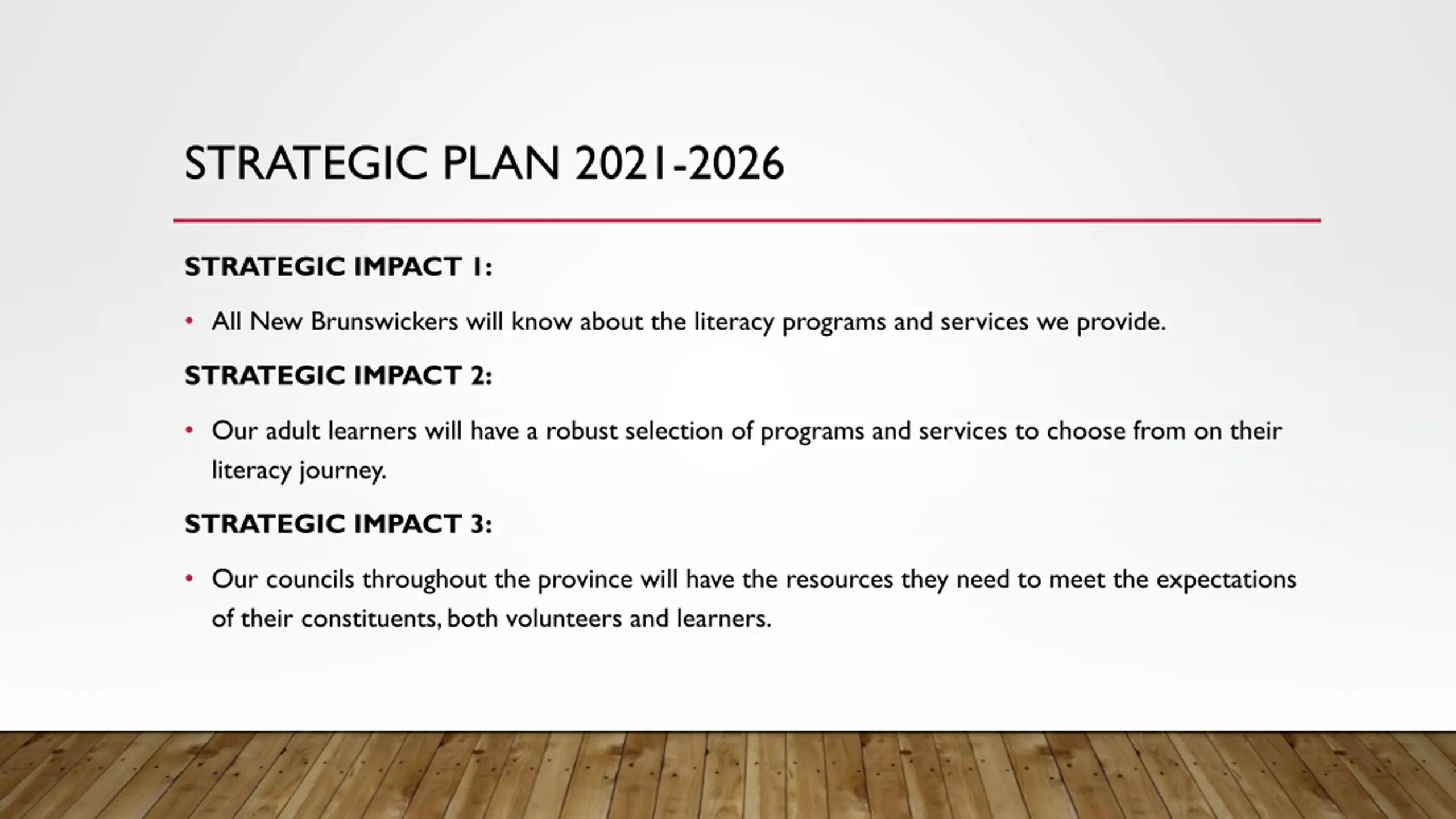 STRATEGIC PLAN 2021-2026 STRATEGIC IMPACT 1: All New Brunswickers will know about the literacy programs and services we provide. STRATEGIC IMPACT 2: Our adult learners will have a robust selection of programs and services to choose from on their literacy journey. STRATEGIC IMPACT 3: Our councils throughout the province will have the resources they need to meet the expectations of their constituents, both volunteers and learners.