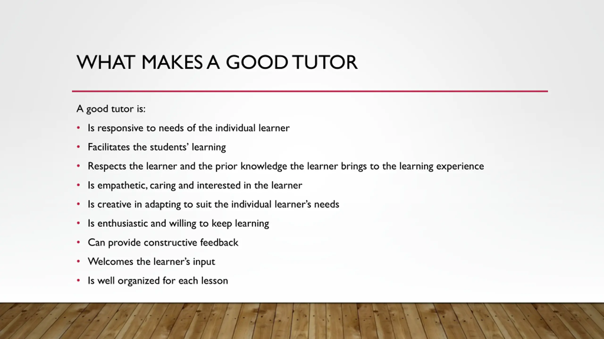 WHAT MAKES A GOOD TUTOR A good tutor is: Is responsive to needs of the individual learner Facilitates the students learning Respects the learner and the prior knowledge the learner brings to the learning experience Is empathetic, caring and interested in the learner Is creative in adapting to suit the individual learner s needs Is enthusiastic and willing to keep learning Can provide constructive feedback Welcomes the learner s input Is well organized for each lesson