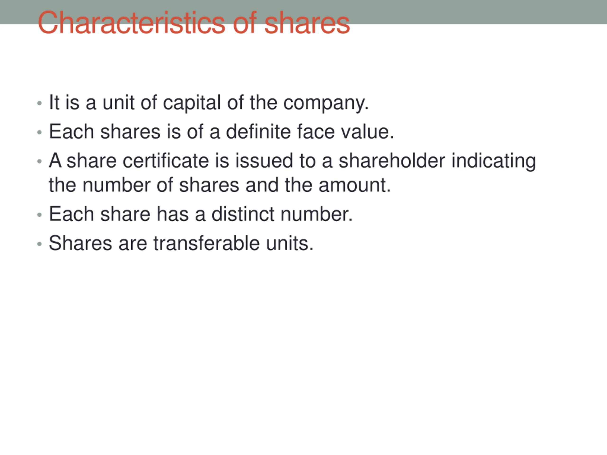 Characteristics of shares It is a unit of capital of the company. Each shares is of a definite face value. A share certificate is issued to a shareholder indicating the number of shares and the amount. Each share has a distinct number. Shares are transferable units.