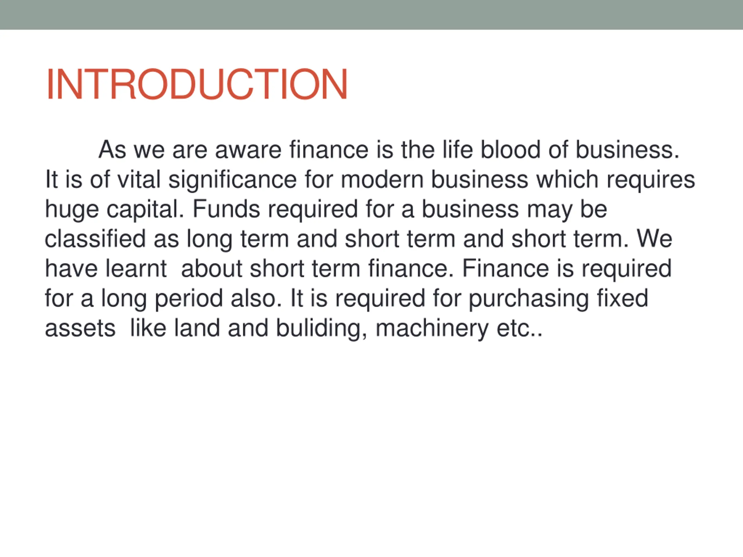 INTRODUCTION As we are aware finance is the life blood of business. It is of vital significance for modern business which requires huge capital. Funds required for a business may be classified as long term and short term and short term. We have learnt about short term finance. Finance is required for a long period also. It is required for purchasing fixed assets like land and buliding, machinery etc..