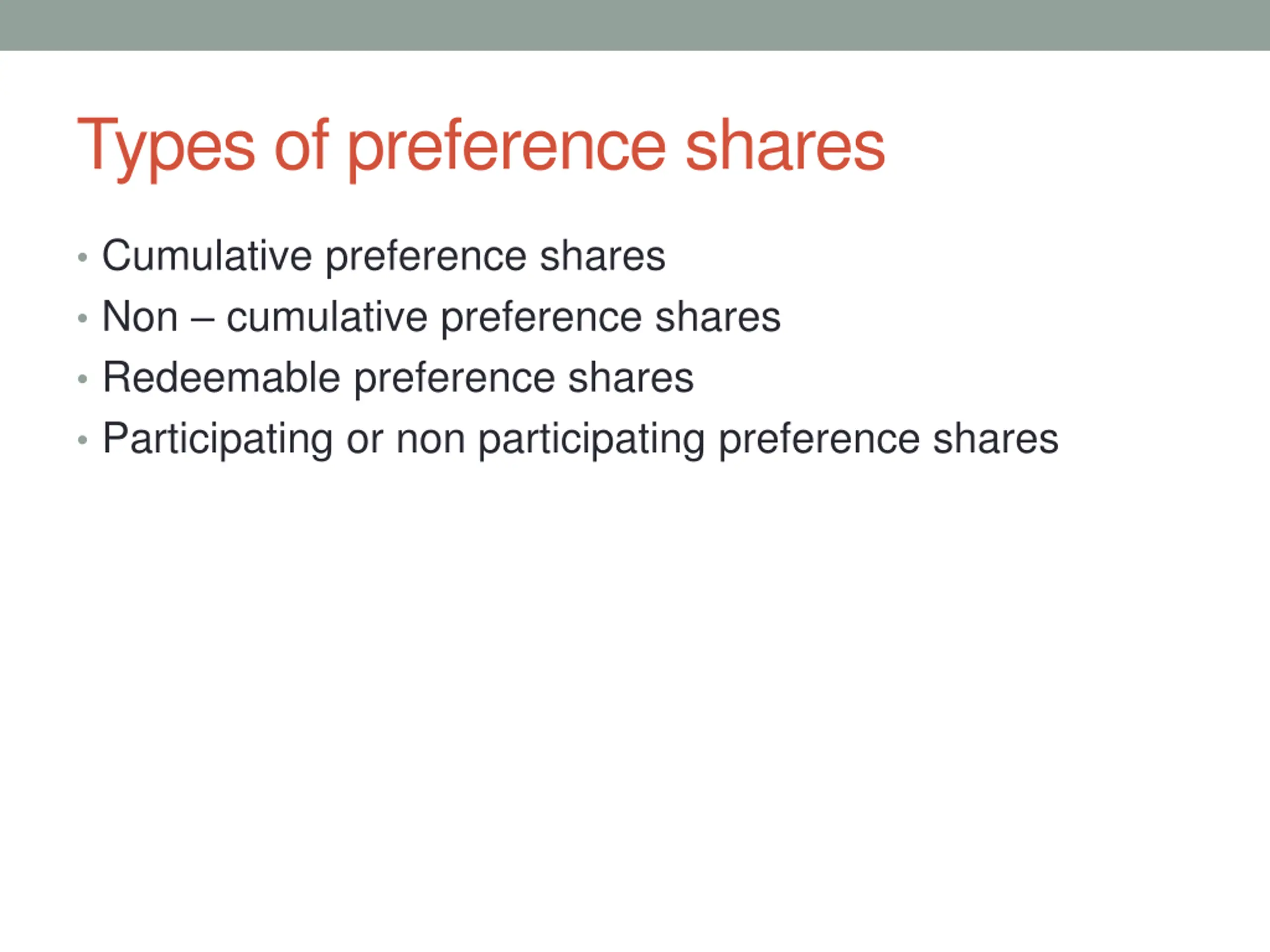 Types of preference shares Cumulative preference shares Non cumulative preference shares Redeemable preference shares Participating or non participating preference shares