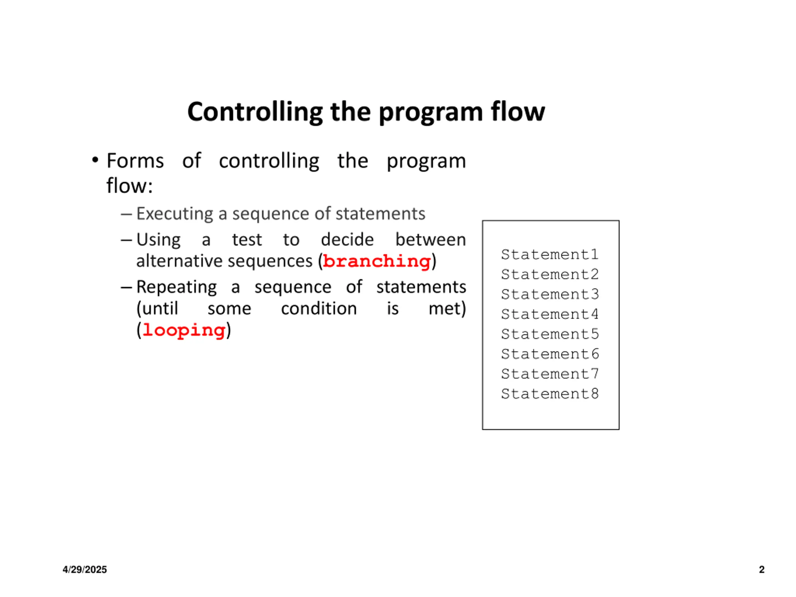 Controlling the program flow Forms of controlling the program flow: Executing a sequence of statements Using a test alternative sequences (branching) Repeating a sequence of statements (until some (looping) to decide between Statement1 Statement2 Statement3 Statement4 Statement5 Statement6 Statement7 Statement8 condition is met) 4/29/2025 2