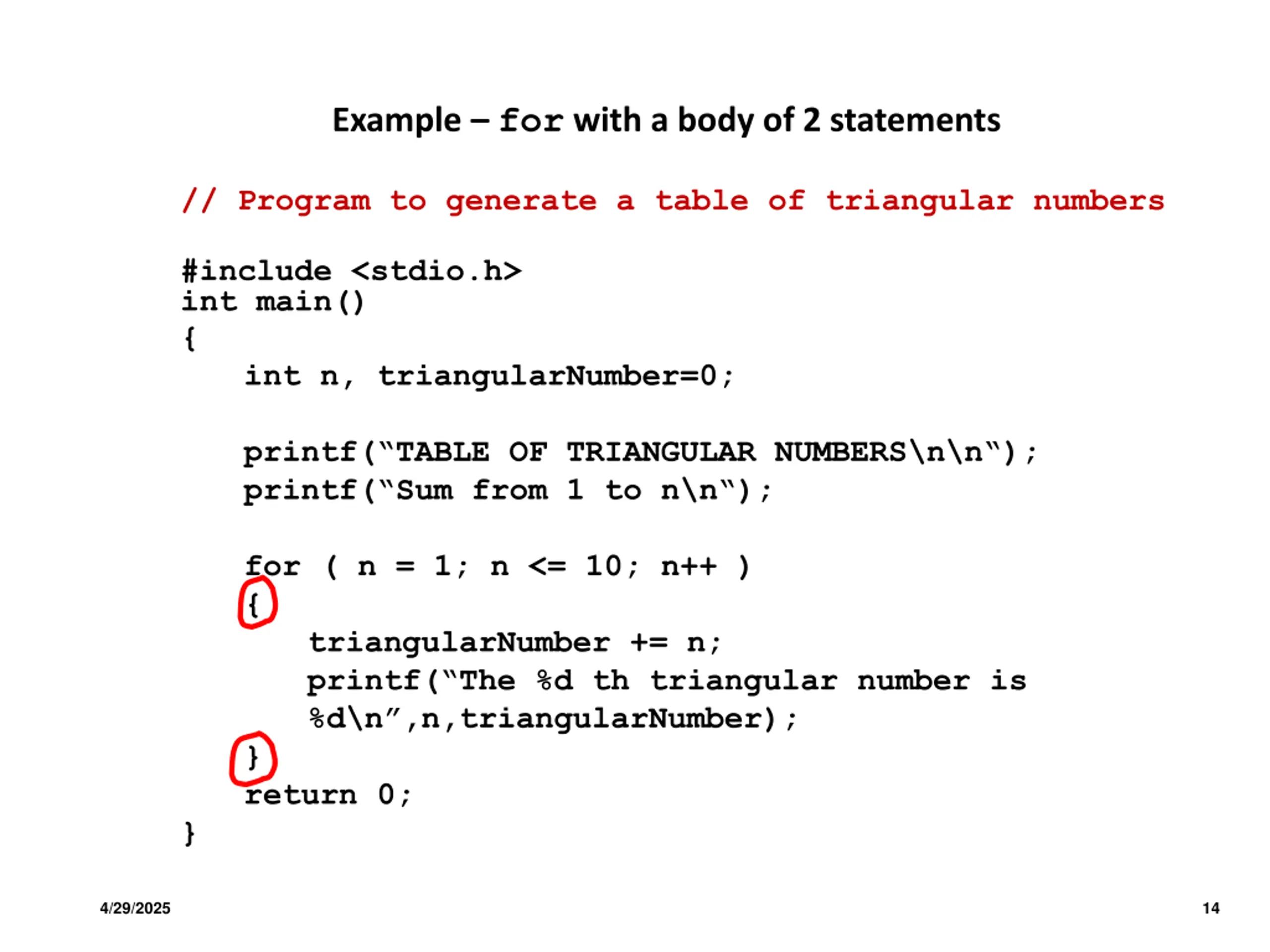 Example for with a body of 2 statements // Program to generate a table of triangular numbers #include <stdio.h> int main() { int n, triangularNumber=0; printf( TABLE OF TRIANGULAR NUMBERS\n\n ); printf( Sum from 1 to n\n ); for ( n = 1; n <= 10; n++ ) { triangularNumber += n; printf( The %d th triangular number is %d\n ,n,triangularNumber); } return 0; } 4/29/2025 14