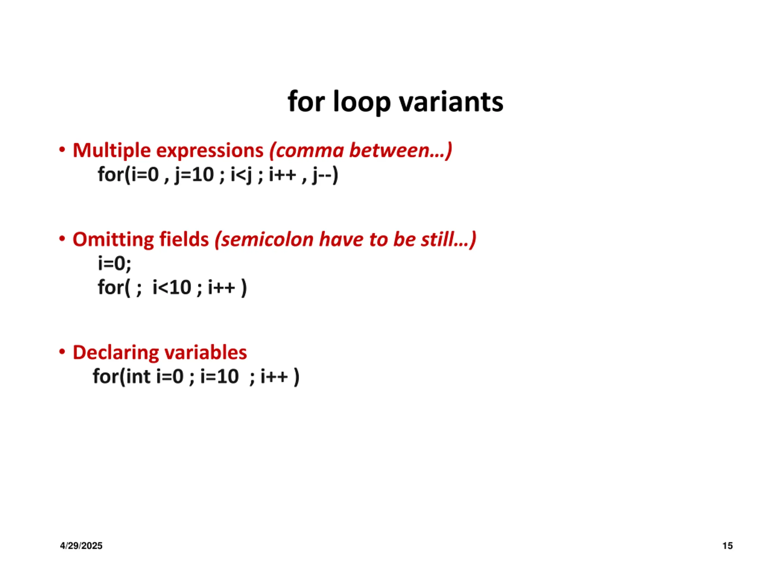 for loop variants Multiple expressions (comma between ) for(i=0 , j=10 ; i<j ; i++ , j--) Omitting fields (semicolon have to be still ) i=0; for( ; i<10 ; i++ ) Declaring variables for(int i=0 ; i=10 ; i++ ) 4/29/2025 15