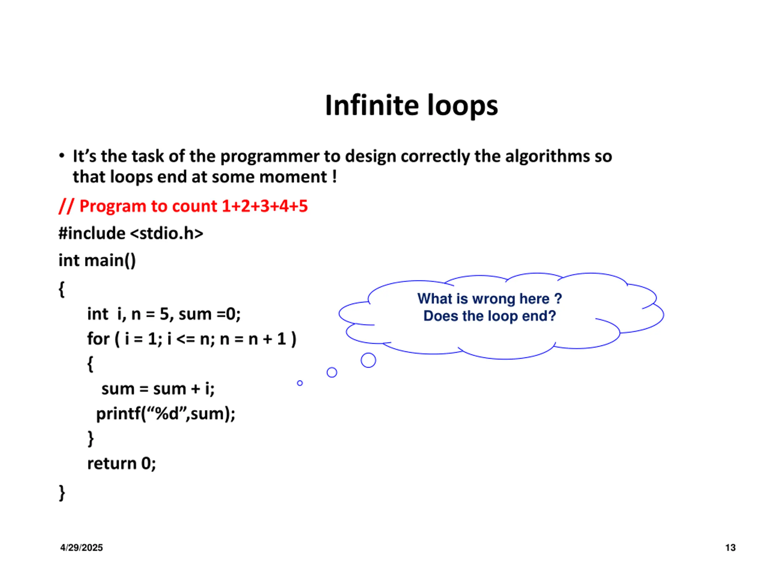 Infinite loops It s the task of the programmer to design correctly the algorithms so that loops end at some moment ! // Program to count 1+2+3+4+5 #include <stdio.h> int main() { What is wrong here ? Does the loop end? int i, n = 5, sum =0; for ( i = 1; i <= n; n = n + 1 ) { sum = sum + i; printf( %d ,sum); } return 0; } 4/29/2025 13