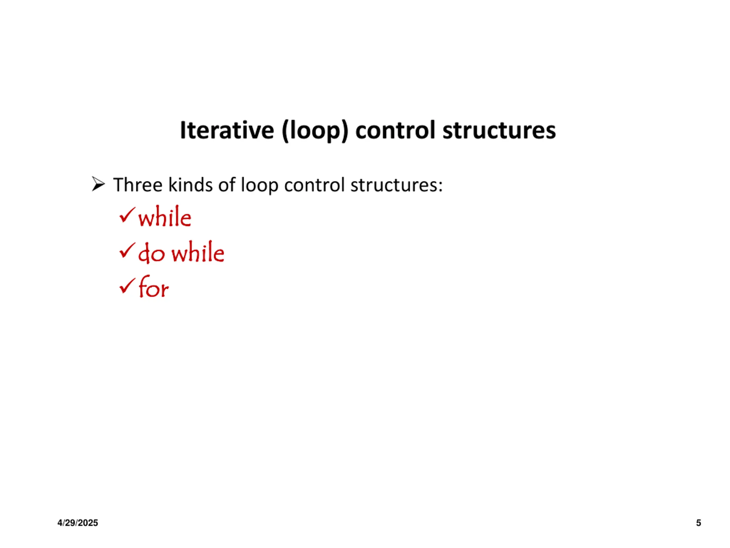 Iterative (loop) control structures Three kinds of loop control structures: while while do do while while for for 4/29/2025 5