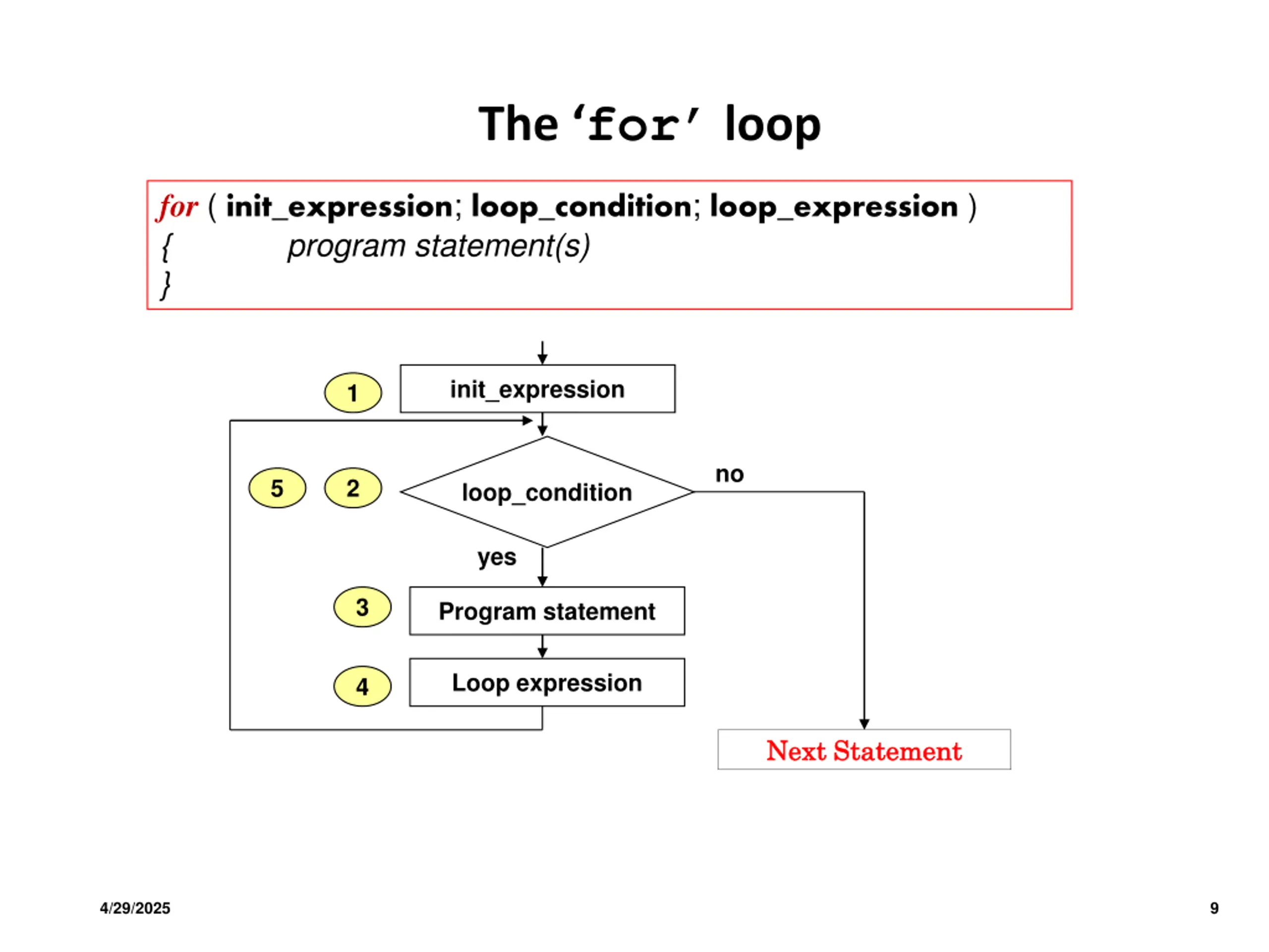 The for loop for ( init_expression; loop_condition; loop_expression ) { program statement(s) } init_expression 1 no 5 2 loop_condition yes 3 Program statement Loop expression 4 Next Statement Next Statement 4/29/2025 9