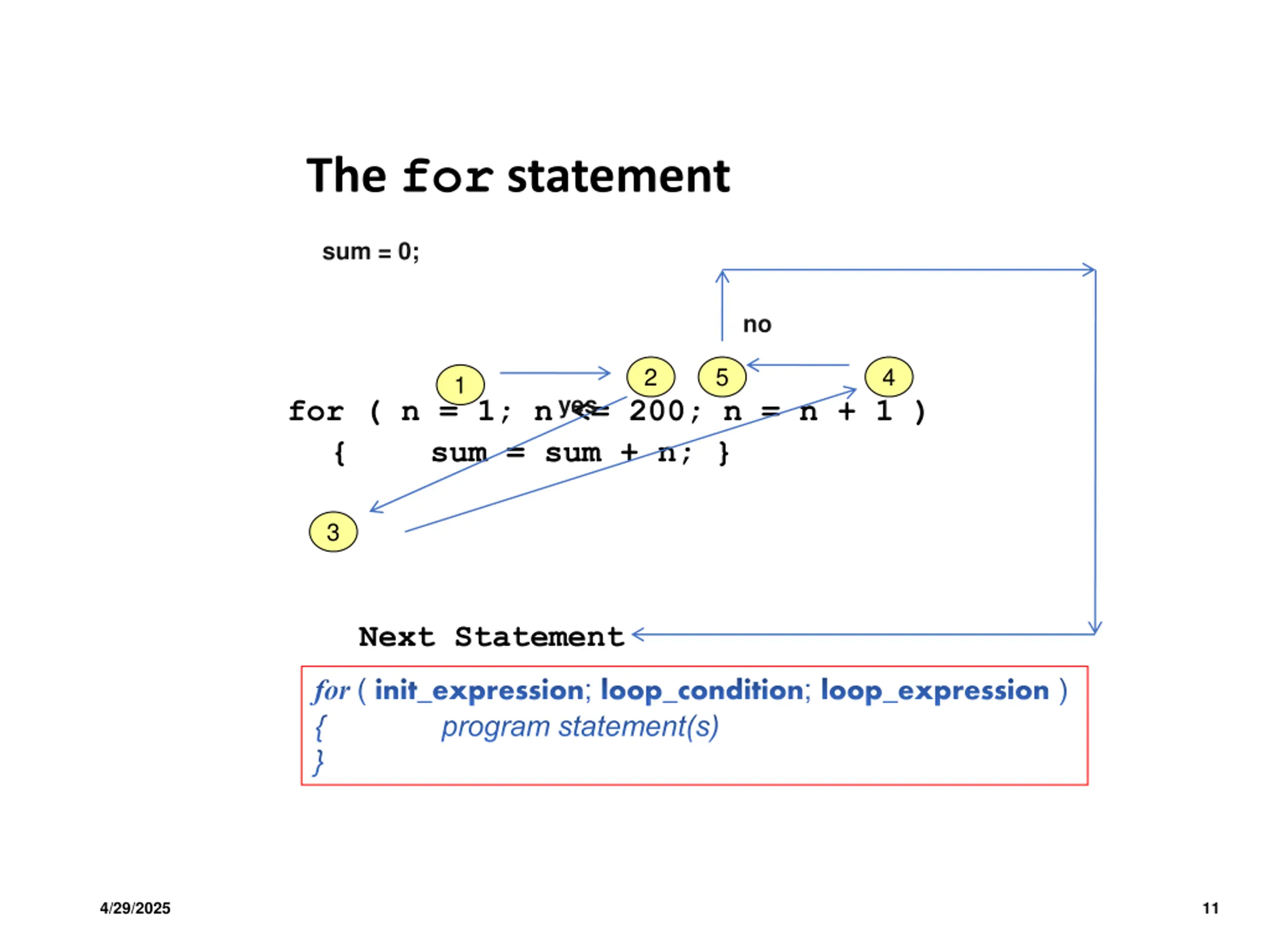 The for statement sum = 0; no 2 5 4 1 yes for ( n = 1; n <= 200; n = n + 1 ) { sum = sum + n; } 3 Next Statement for ( init_expression; loop_condition; loop_expression ) { program statement(s) } 4/29/2025 11