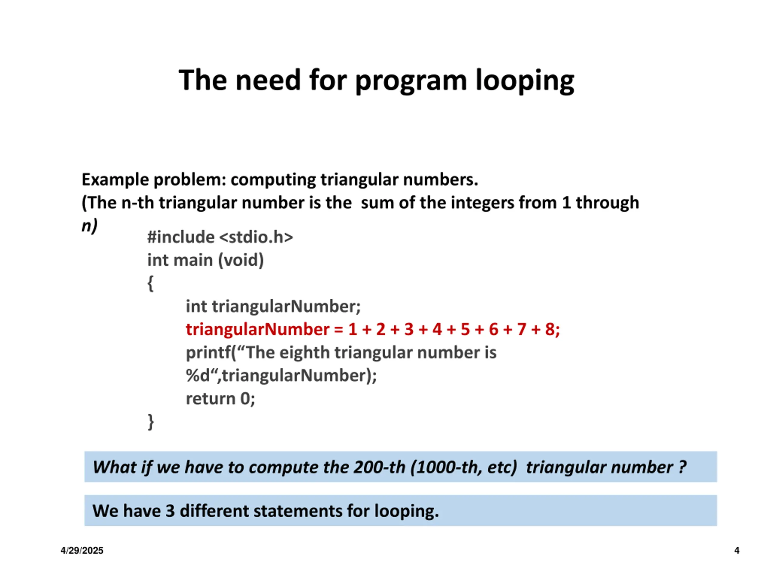 The need for program looping Example problem: computing triangular numbers. (The n-th triangular number is the sum of the integers from 1 through n) #include <stdio.h> int main (void) { int triangularNumber; triangularNumber = 1 + 2 + 3 + 4 + 5 + 6 + 7 + 8; printf( The eighth triangular number is %d ,triangularNumber); return 0; } What if we have to compute the 200-th (1000-th, etc) triangular number ? We have 3 different statements for looping. 4/29/2025 4