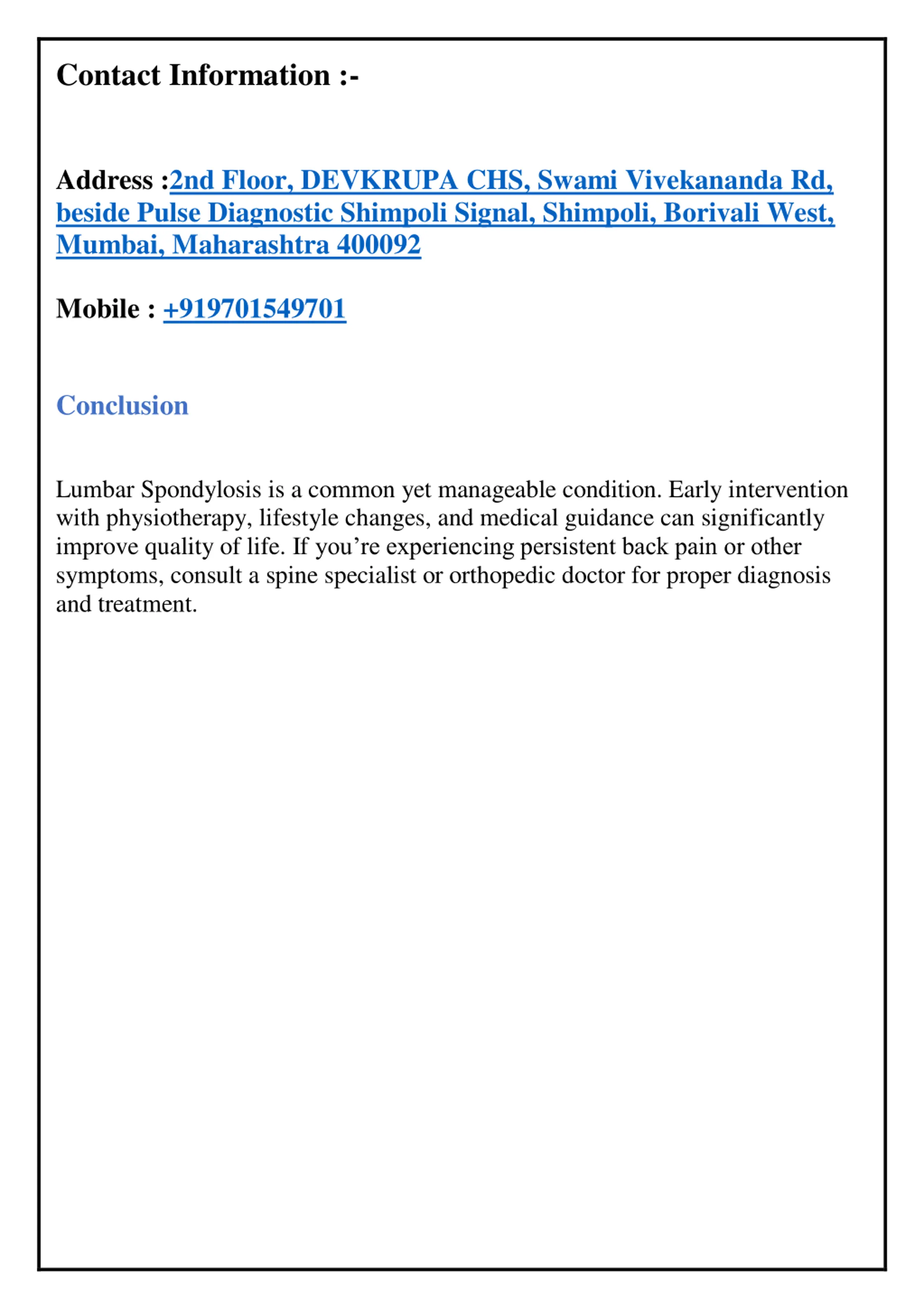 Contact Information :- Address :2nd Floor, DEVKRUPA CHS, Swami Vivekananda Rd, beside Pulse Diagnostic Shimpoli Signal, Shimpoli, Borivali West, Mumbai, Maharashtra 400092 Mobile : +919701549701 Conclusion Lumbar Spondylosis is a common yet manageable condition. Early intervention with physiotherapy, lifestyle changes, and medical guidance can significantly improve quality of life. If you re experiencing persistent back pain or other symptoms, consult a spine specialist or orthopedic doctor for proper diagnosis and treatment.