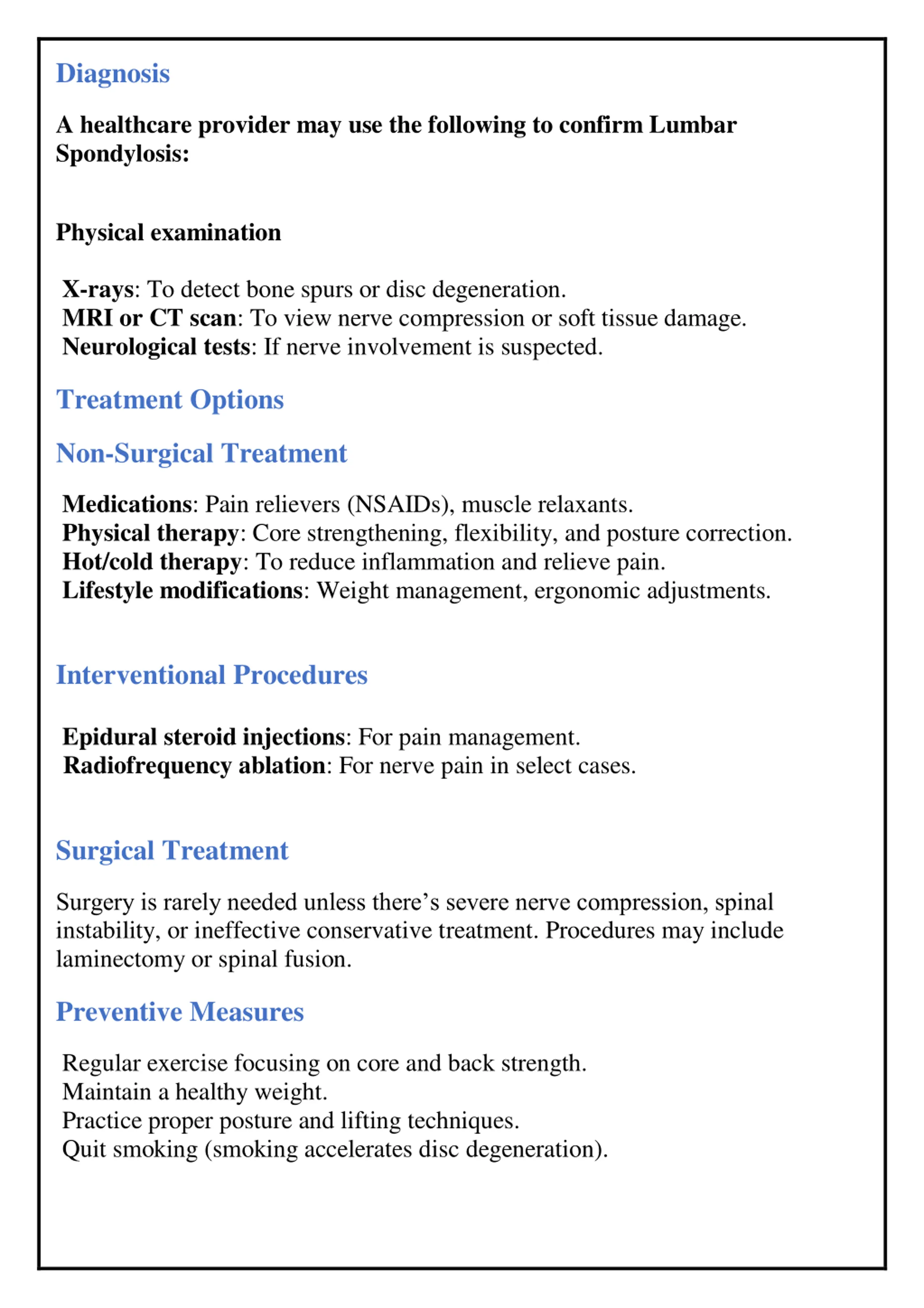 Diagnosis A healthcare provider may use the following to confirm Lumbar Spondylosis: Physical examination X-rays: To detect bone spurs or disc degeneration. MRI or CT scan: To view nerve compression or soft tissue damage. Neurological tests: If nerve involvement is suspected. Treatment Options Non-Surgical Treatment Medications: Pain relievers (NSAIDs), muscle relaxants. Physical therapy: Core strengthening, flexibility, and posture correction. Hot/cold therapy: To reduce inflammation and relieve pain. Lifestyle modifications: Weight management, ergonomic adjustments. Interventional Procedures Epidural steroid injections: For pain management. Radiofrequency ablation: For nerve pain in select cases. Surgical Treatment Surgery is rarely needed unless there s severe nerve compression, spinal instability, or ineffective conservative treatment. Procedures may include laminectomy or spinal fusion. Preventive Measures Regular exercise focusing on core and back strength. Maintain a healthy weight. Practice proper posture and lifting techniques. Quit smoking (smoking accelerates disc degeneration).