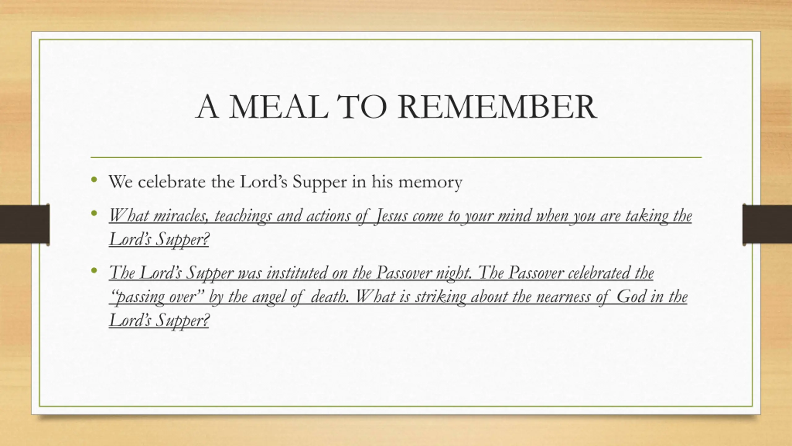 A MEAL TO REMEMBER We celebrate the Lord s Supper in his memory What miracles, teachings and actions of Jesus come to your mind when you are taking the Lord s Supper? The Lord s Supper was instituted on the Passover night. The Passover celebrated the passing over by the angel of death. What is striking about the nearness of God in the Lord s Supper?