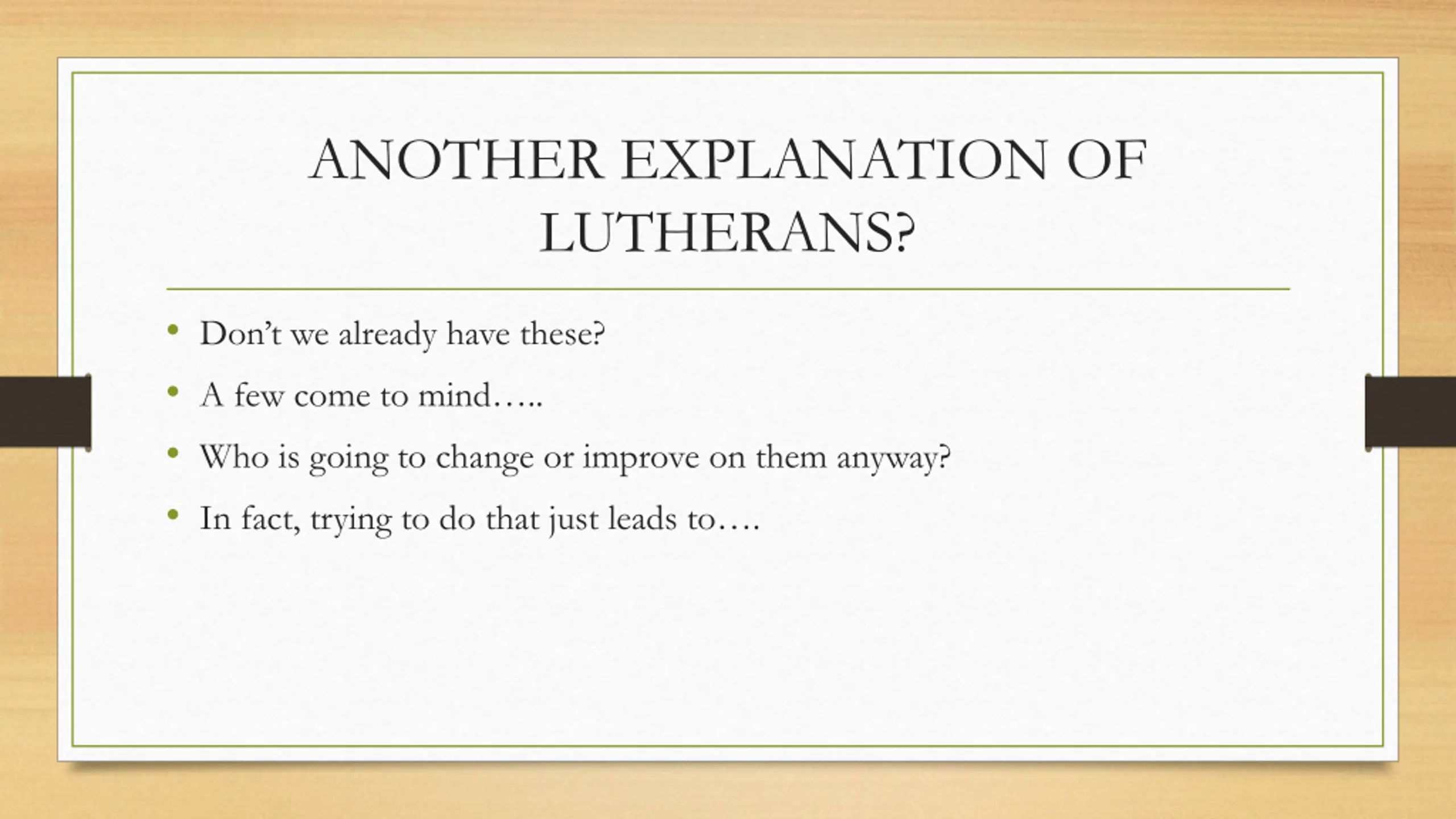 ANOTHER EXPLANATION OF LUTHERANS? Don t we already have these? A few come to mind .. Who is going to change or improve on them anyway? In fact, trying to do that just leads to .