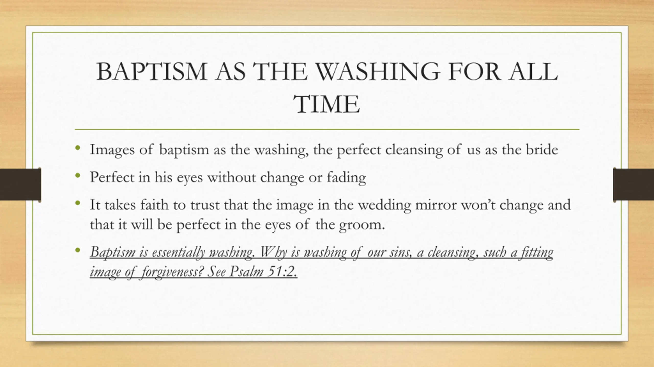 BAPTISM AS THE WASHING FOR ALL TIME Images of baptism as the washing, the perfect cleansing of us as the bride Perfect in his eyes without change or fading It takes faith to trust that the image in the wedding mirror won t change and that it will be perfect in the eyes of the groom. Baptism is essentially washing. Why is washing of our sins, a cleansing, such a fitting image of forgiveness? See Psalm 51:2.