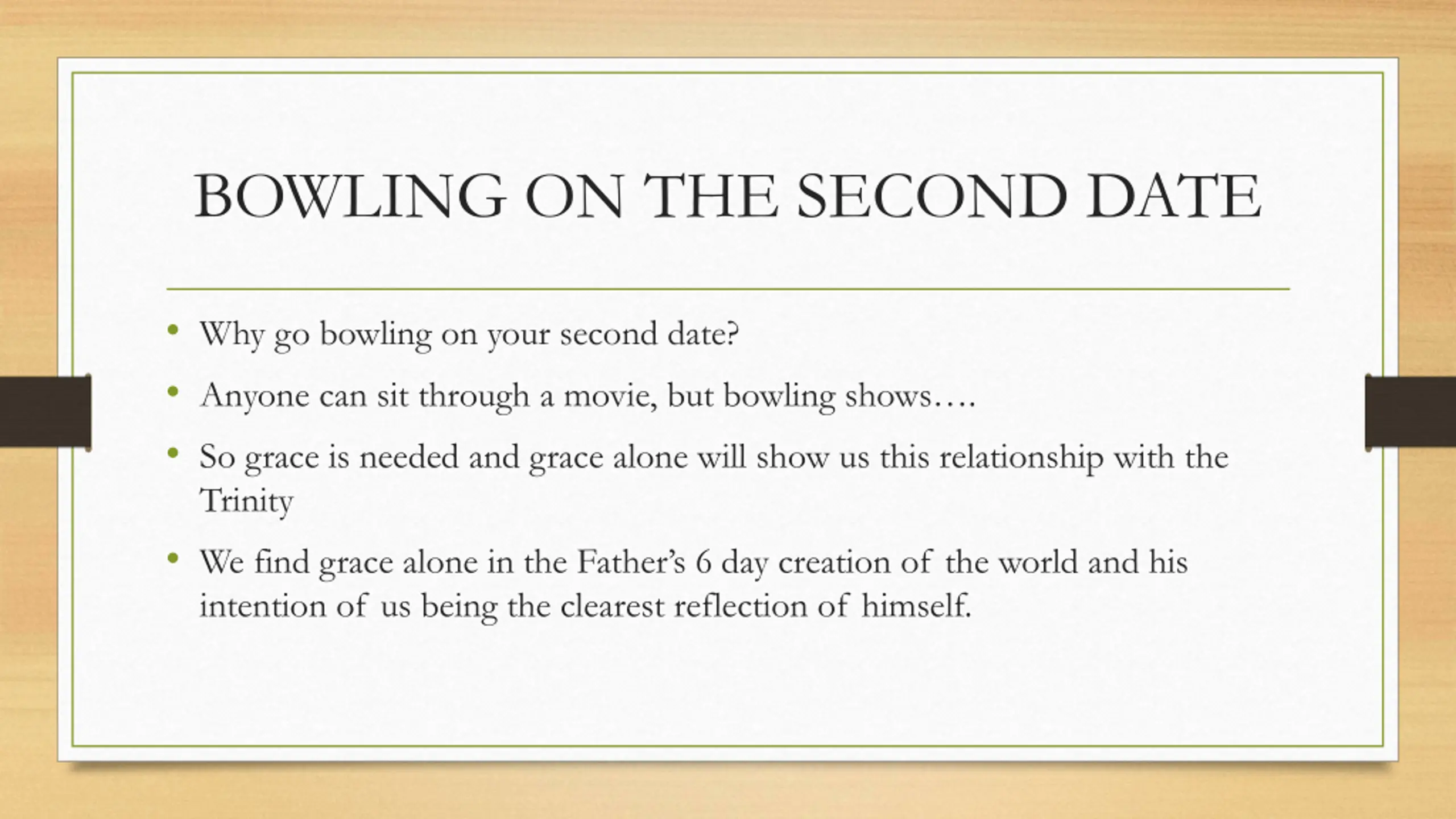 BOWLING ON THE SECOND DATE Why go bowling on your second date? Anyone can sit through a movie, but bowling shows . So grace is needed and grace alone will show us this relationship with the Trinity We find grace alone in the Father s 6 day creation of the world and his intention of us being the clearest reflection of himself.
