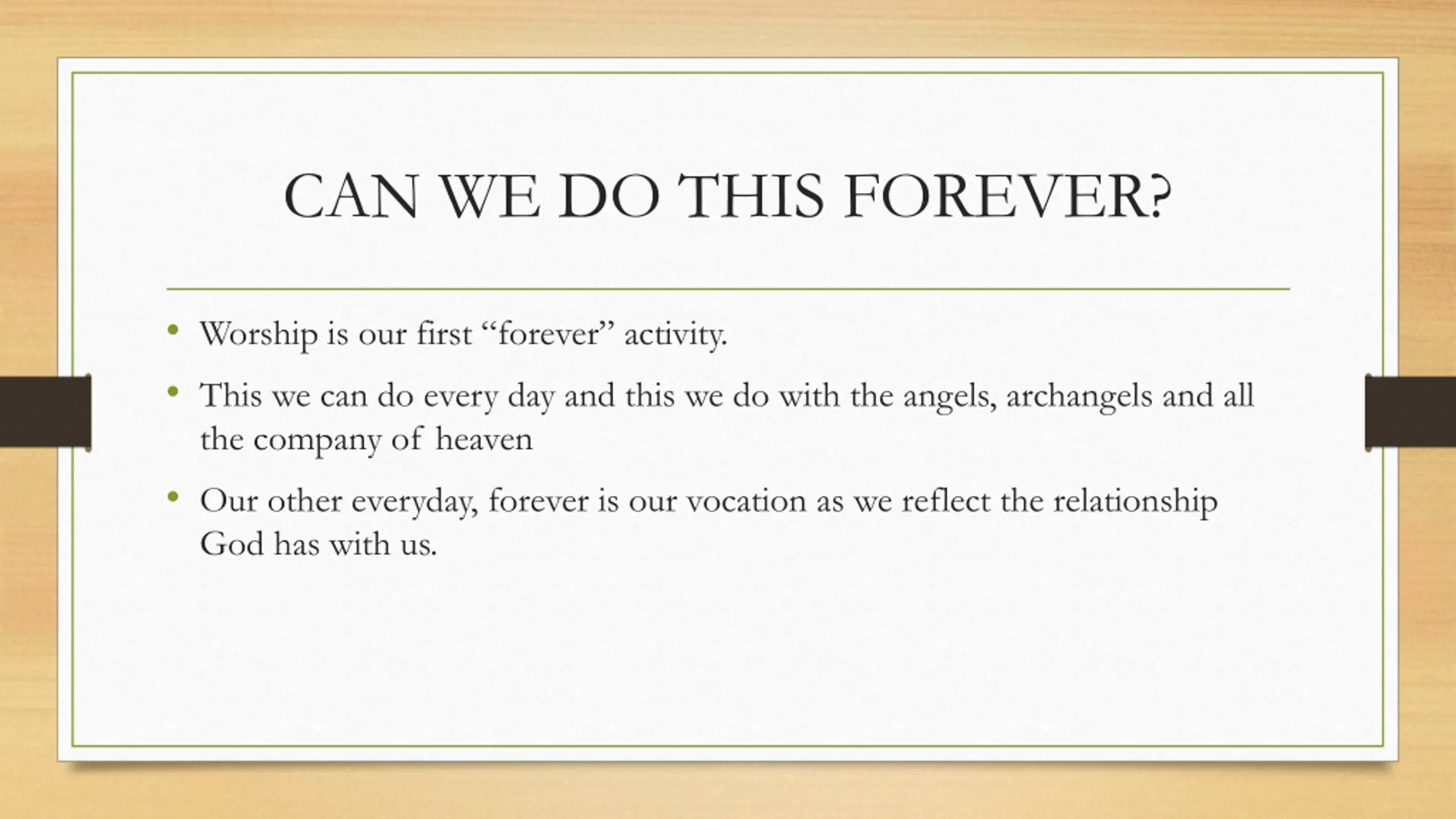 CAN WE DO THIS FOREVER? Worship is our first forever activity. This we can do every day and this we do with the angels, archangels and all the company of heaven Our other everyday, forever is our vocation as we reflect the relationship God has with us.