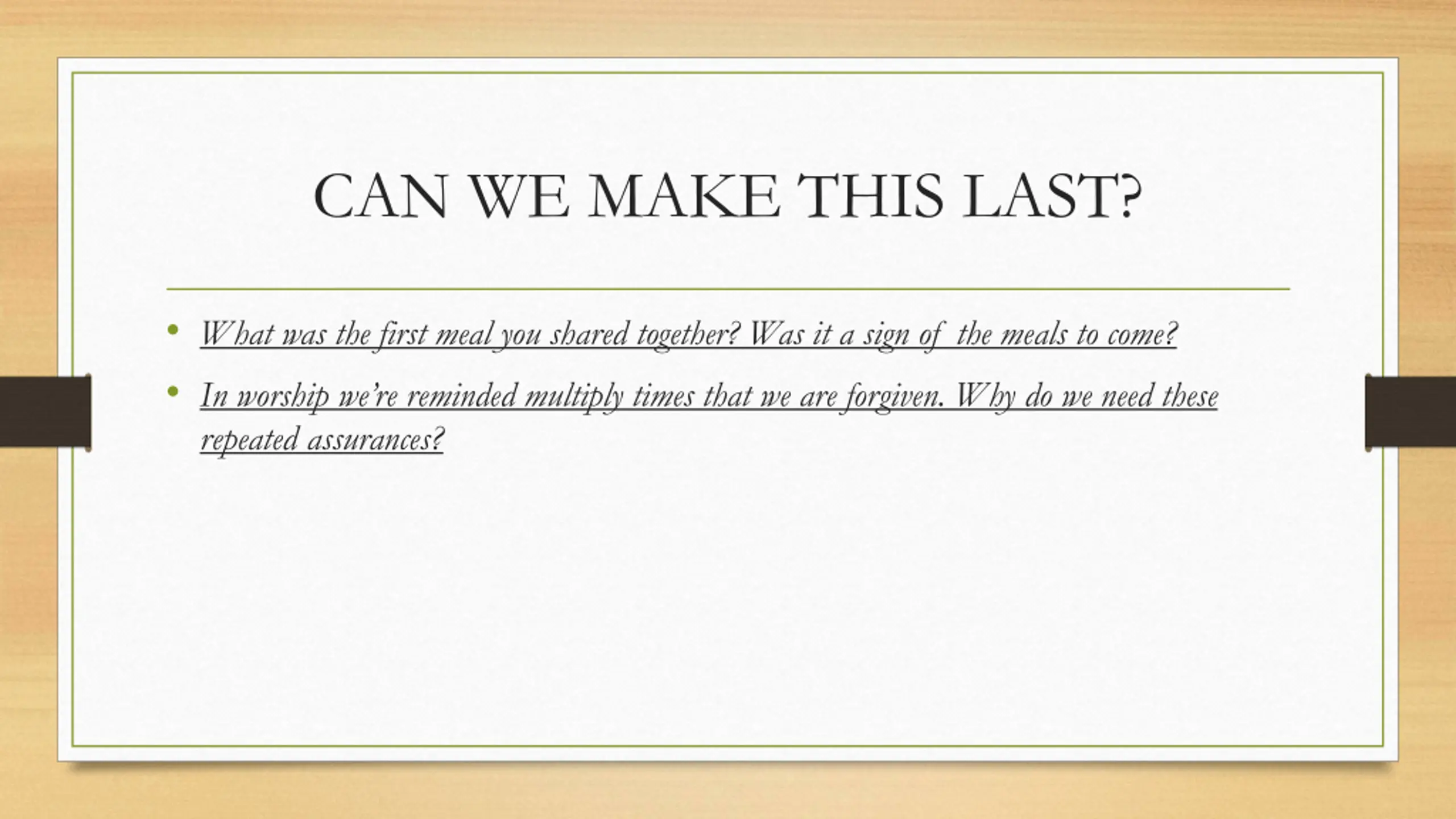 CAN WE MAKE THIS LAST? What was the first meal you shared together? Was it a sign of the meals to come? In worship we re reminded multiply times that we are forgiven. Why do we need these repeated assurances?