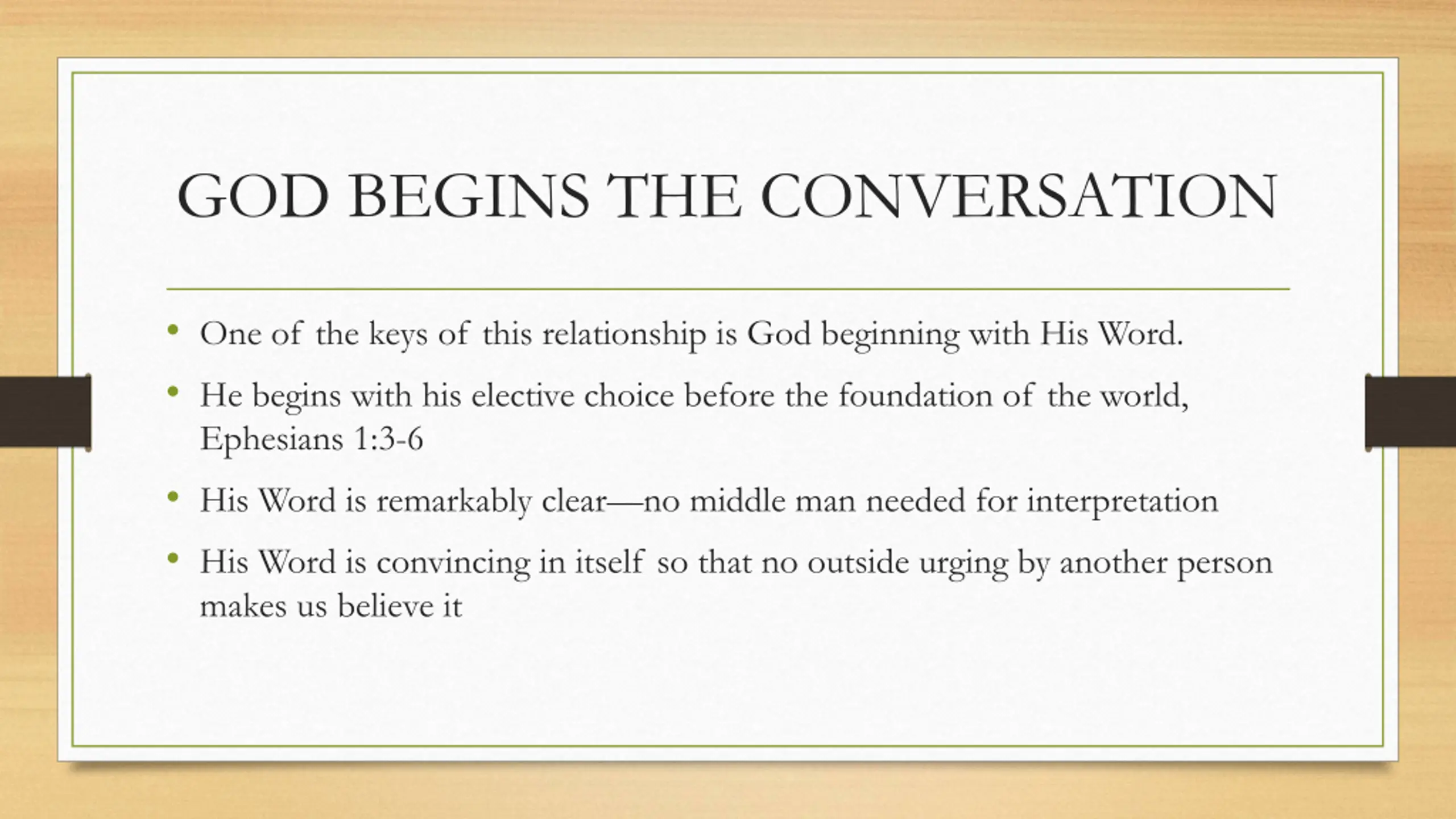 GOD BEGINS THE CONVERSATION One of the keys of this relationship is God beginning with His Word. He begins with his elective choice before the foundation of the world, Ephesians 1:3-6 His Word is remarkably clear no middle man needed for interpretation His Word is convincing in itself so that no outside urging by another person makes us believe it