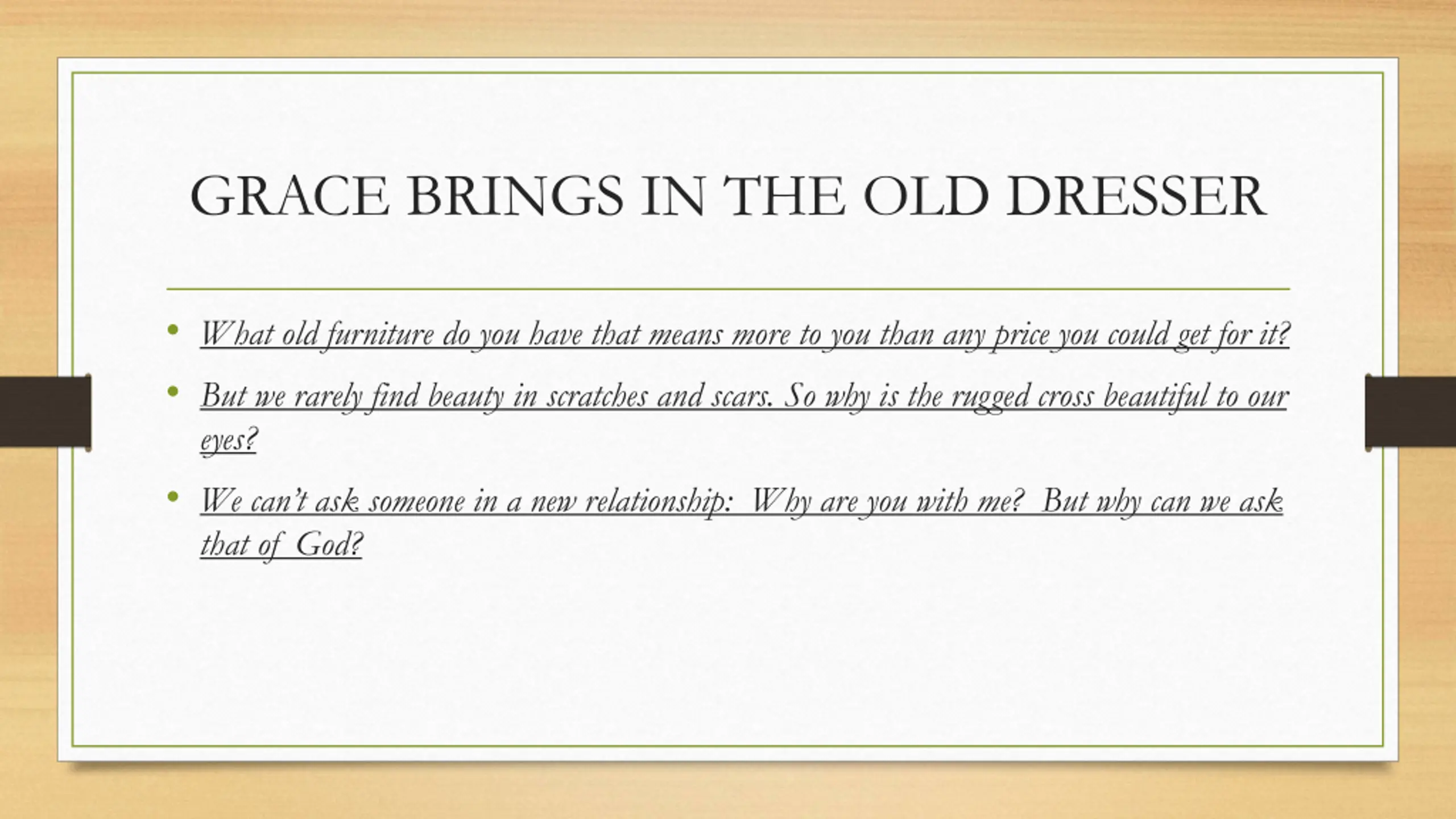 GRACE BRINGS IN THE OLD DRESSER What old furniture do you have that means more to you than any price you could get for it? But we rarely find beauty in scratches and scars. So why is the rugged cross beautiful to our eyes? We can t ask someone in a new relationship: Why are you with me? But why can we ask that of God?
