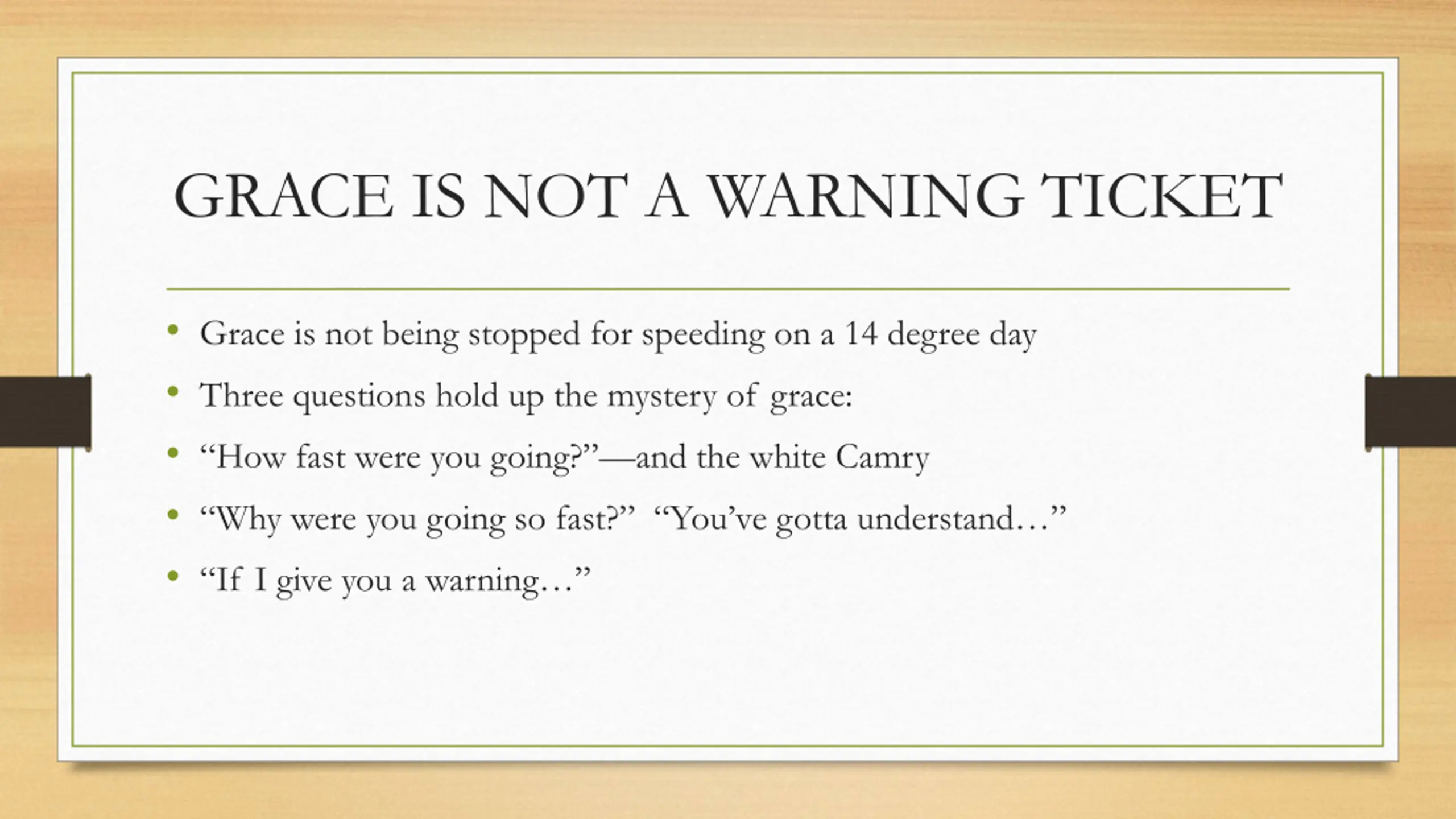 GRACE IS NOT A WARNING TICKET Grace is not being stopped for speeding on a 14 degree day Three questions hold up the mystery of grace: How fast were you going? and the white Camry Why were you going so fast? You ve gotta understand If I give you a warning