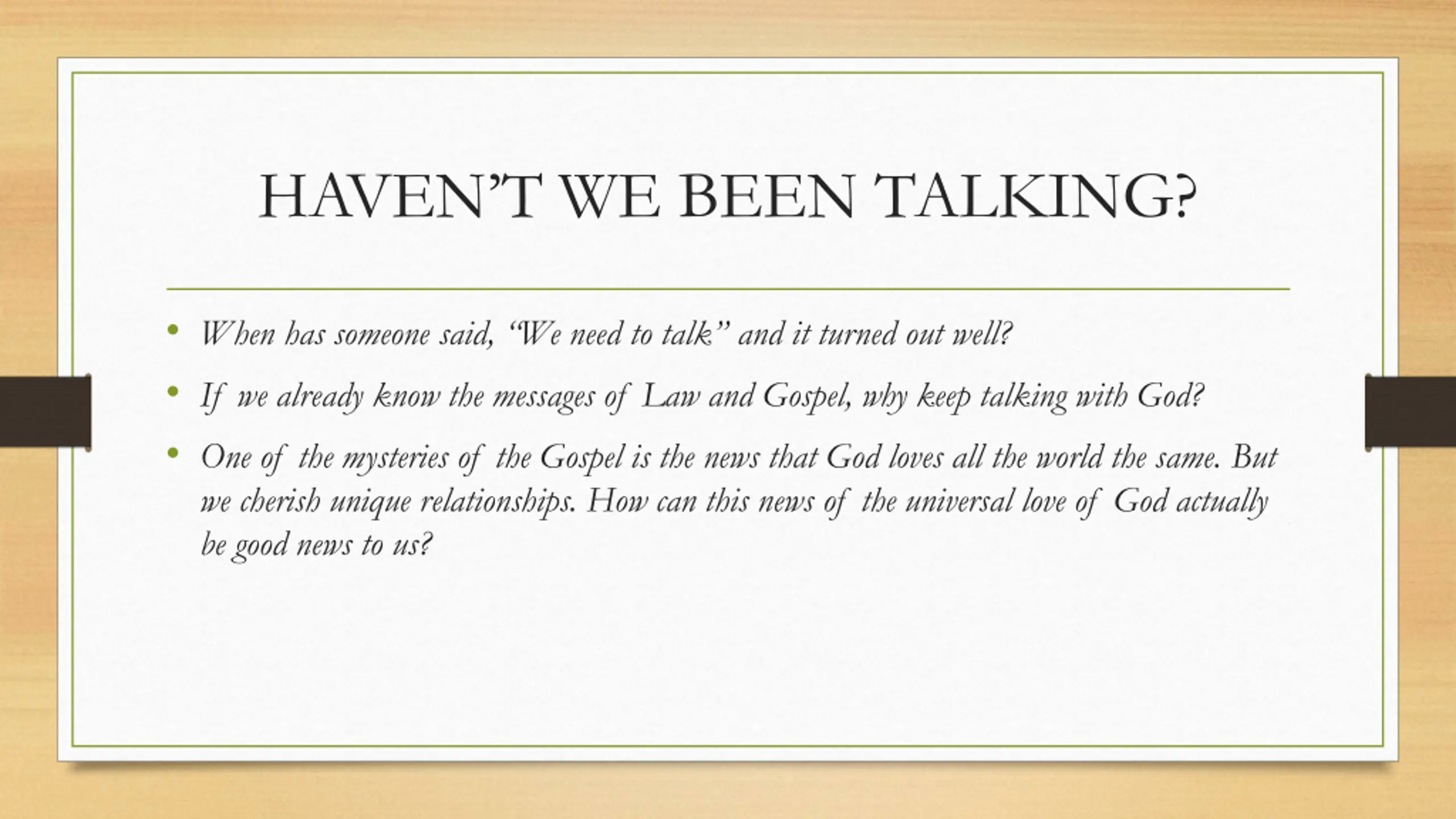 HAVENT WE BEEN TALKING? When has someone said, We need to talk and it turned out well? If we already know the messages of Law and Gospel, why keep talking with God? One of the mysteries of the Gospel is the news that God loves all the world the same. But we cherish unique relationships. How can this news of the universal love of God actually be good news to us?