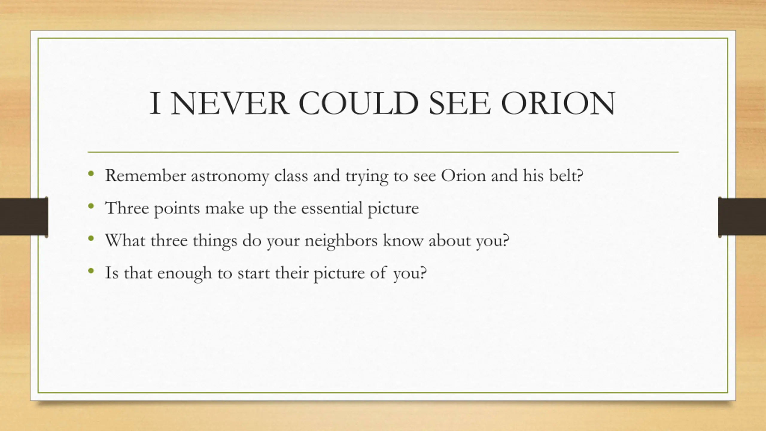 I NEVER COULD SEE ORION Remember astronomy class and trying to see Orion and his belt? Three points make up the essential picture What three things do your neighbors know about you? Is that enough to start their picture of you?