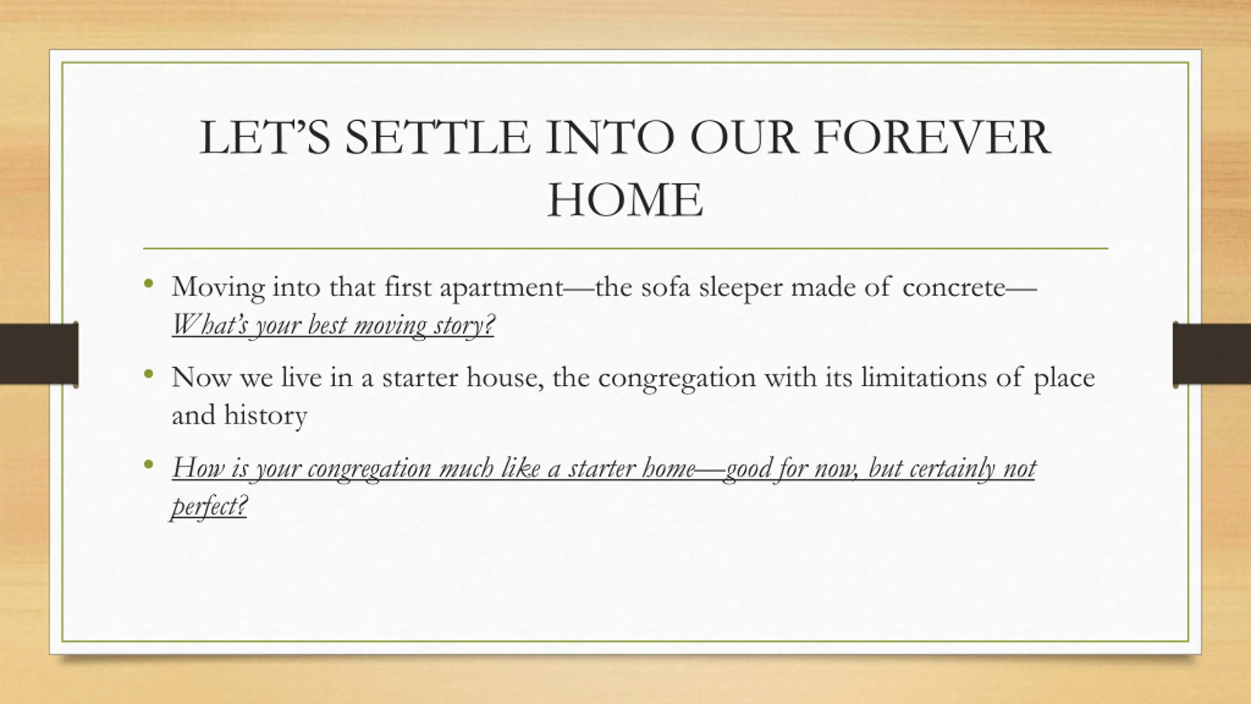 LETS SETTLE INTO OUR FOREVER HOME Moving into that first apartment the sofa sleeper made of concrete What s your best moving story? Now we live in a starter house, the congregation with its limitations of place and history How is your congregation much like a starter home good for now, but certainly not perfect?