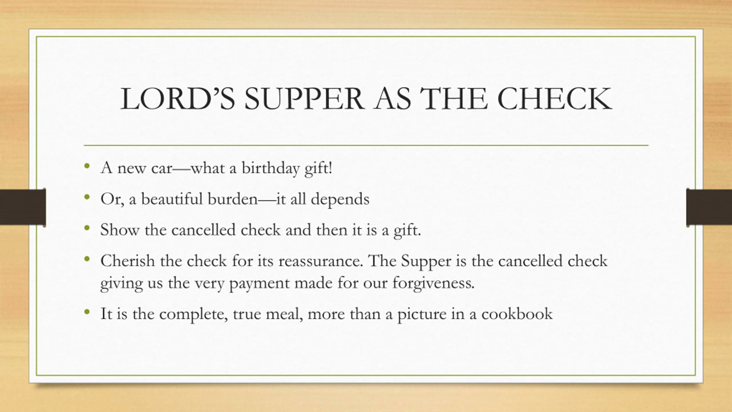 LORDS SUPPER AS THE CHECK A new car what a birthday gift! Or, a beautiful burden it all depends Show the cancelled check and then it is a gift. Cherish the check for its reassurance. The Supper is the cancelled check giving us the very payment made for our forgiveness. It is the complete, true meal, more than a picture in a cookbook
