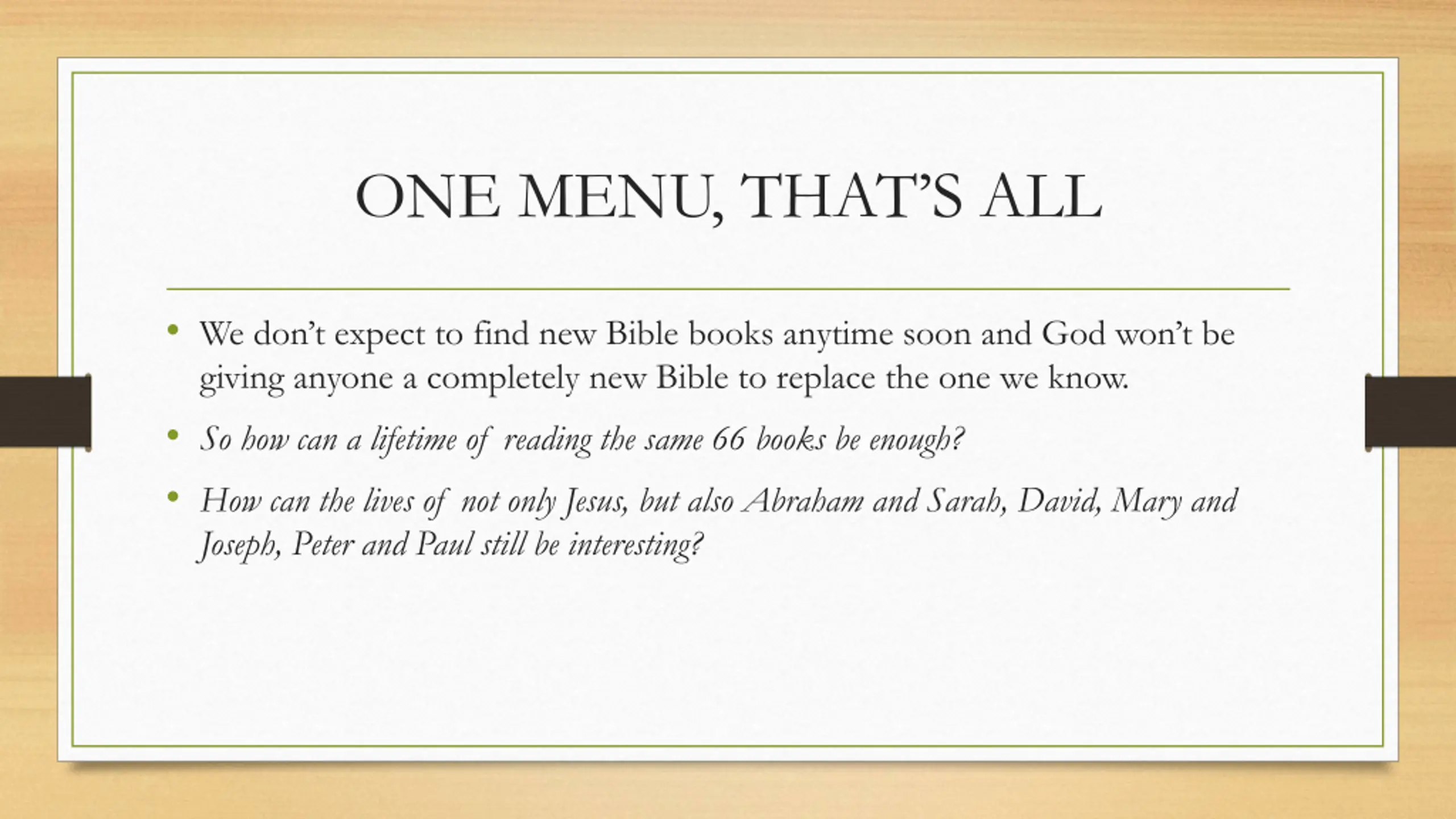 ONE MENU, THATS ALL We don t expect to find new Bible books anytime soon and God won t be giving anyone a completely new Bible to replace the one we know. So how can a lifetime of reading the same 66 books be enough? How can the lives of not only Jesus, but also Abraham and Sarah, David, Mary and Joseph, Peter and Paul still be interesting?