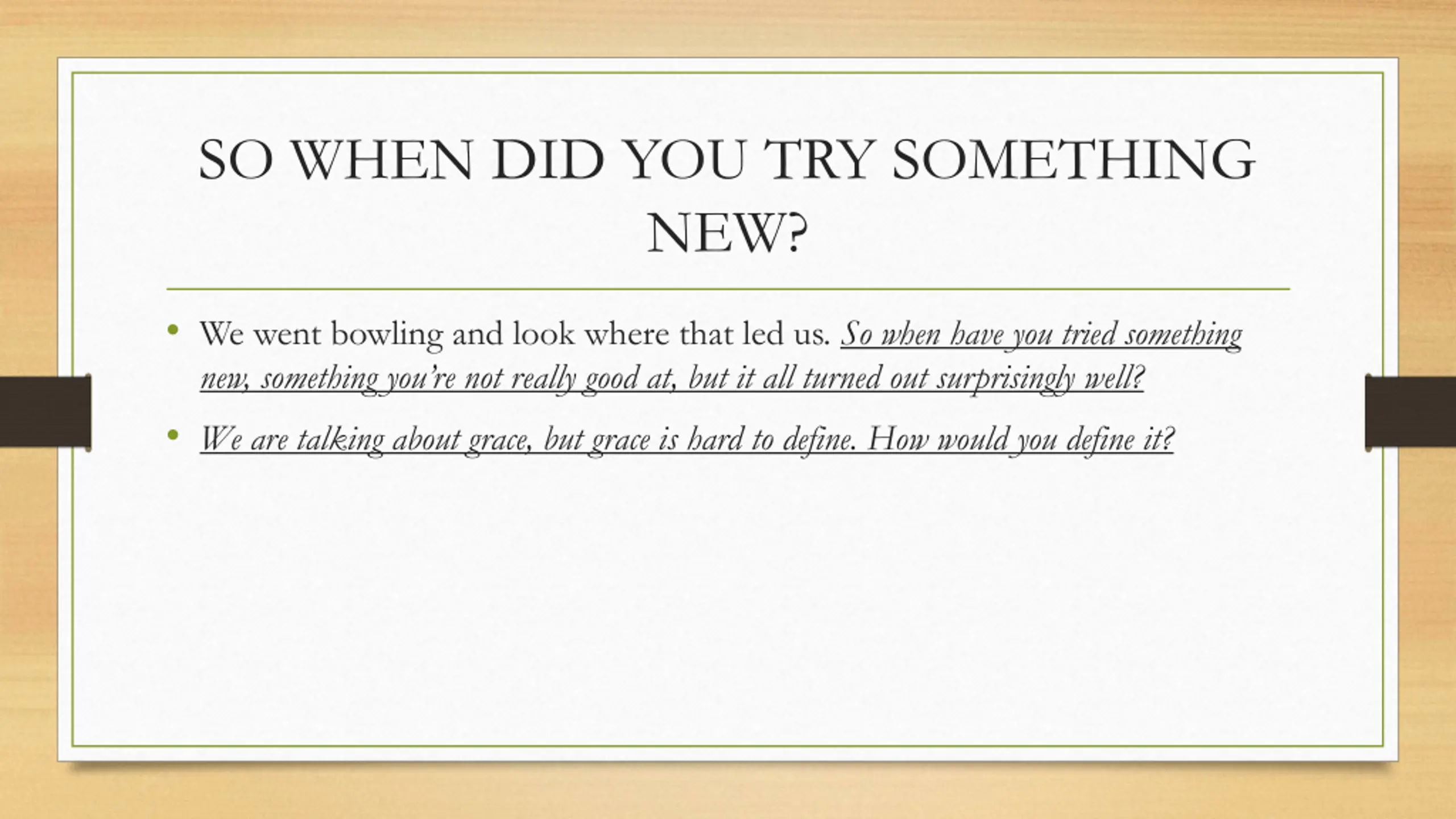 SO WHEN DID YOU TRY SOMETHING NEW? We went bowling and look where that led us. So when have you tried something new, something you re not really good at, but it all turned out surprisingly well? We are talking about grace, but grace is hard to define. How would you define it?