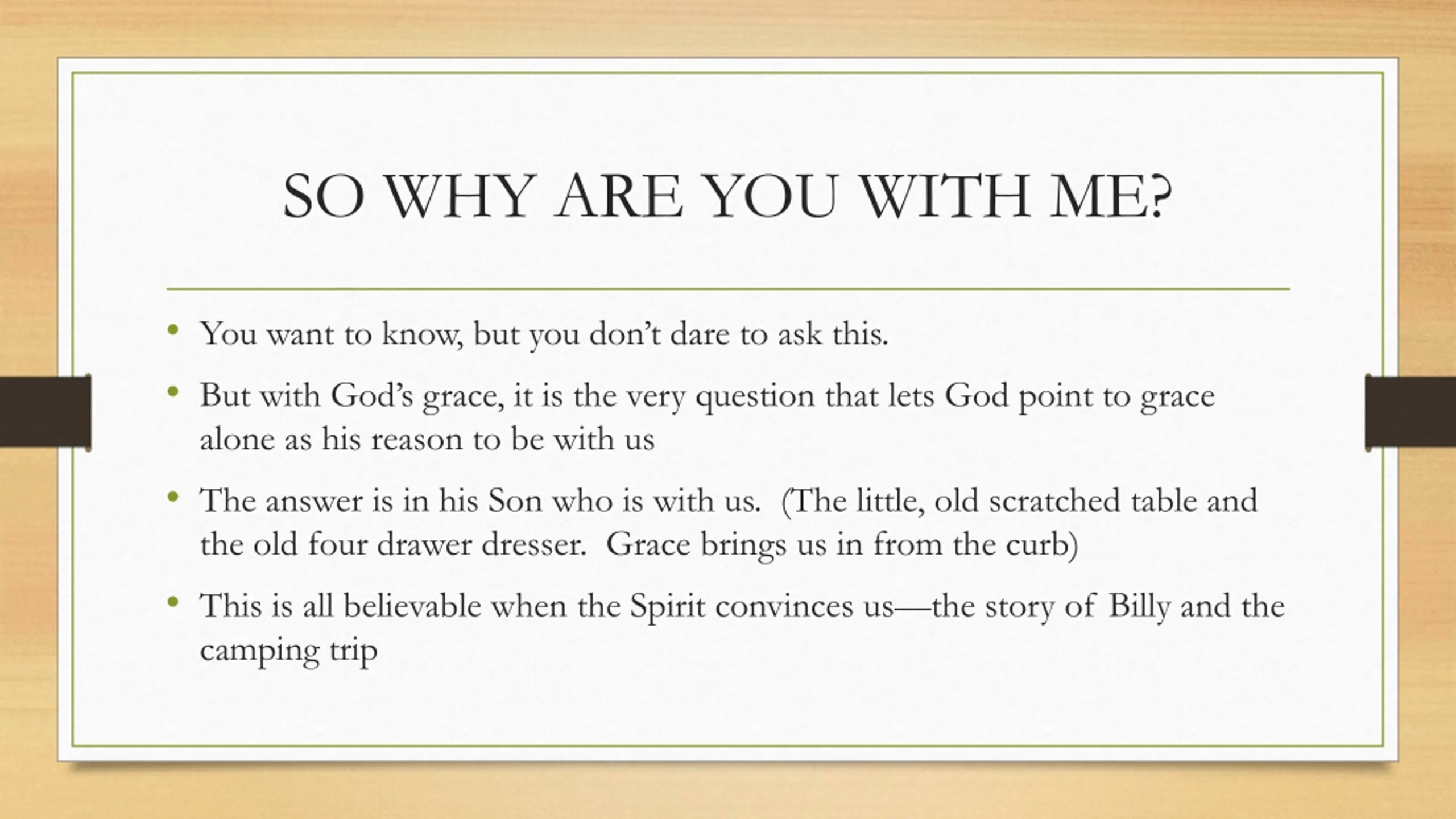 SO WHY ARE YOU WITH ME? You want to know, but you don t dare to ask this. But with God s grace, it is the very question that lets God point to grace alone as his reason to be with us The answer is in his Son who is with us. (The little, old scratched table and the old four drawer dresser. Grace brings us in from the curb) This is all believable when the Spirit convinces us the story of Billy and the camping trip