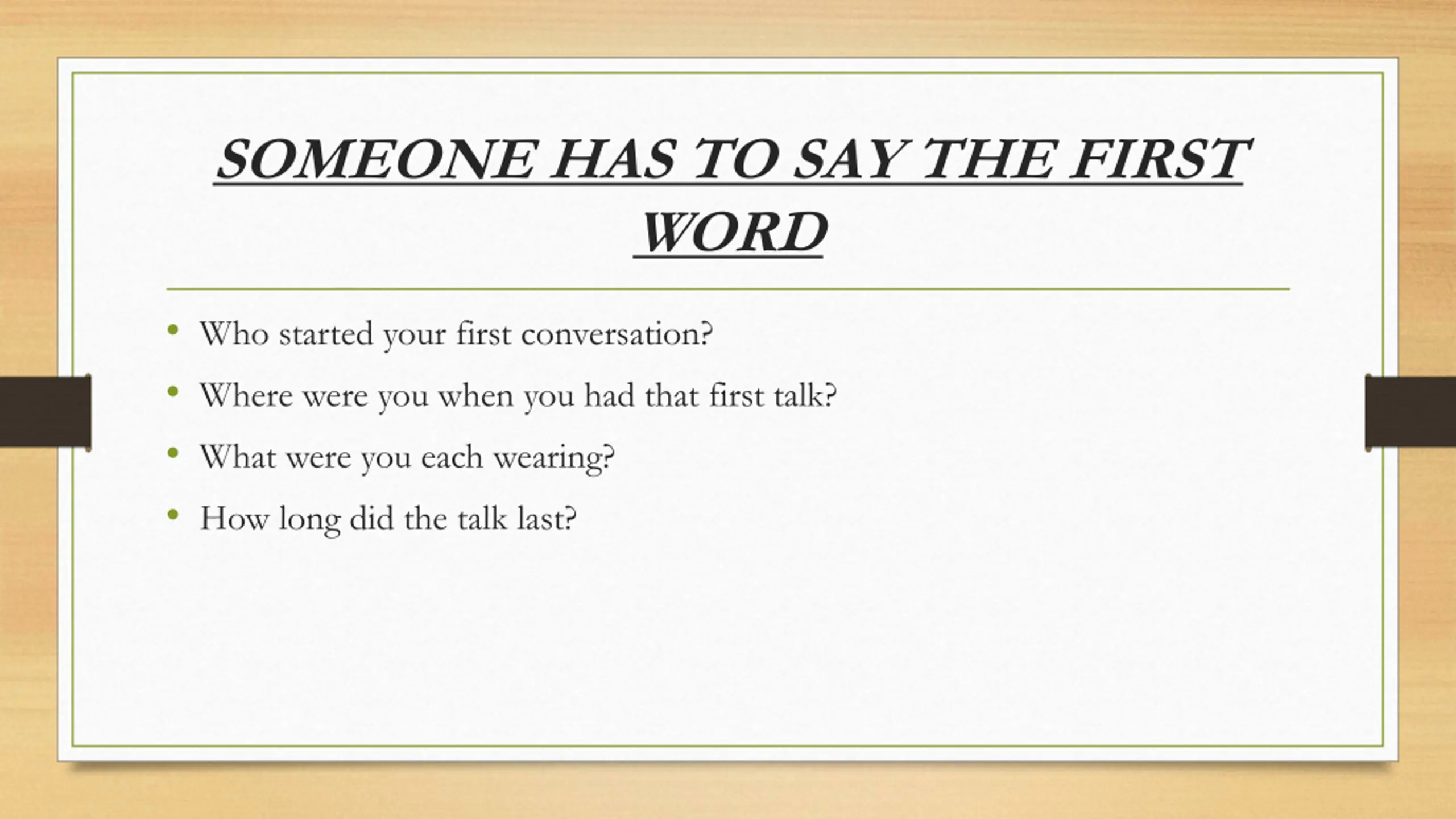 SOMEONE HAS TO SAY THE FIRST WORD Who started your first conversation? Where were you when you had that first talk? What were you each wearing? How long did the talk last?