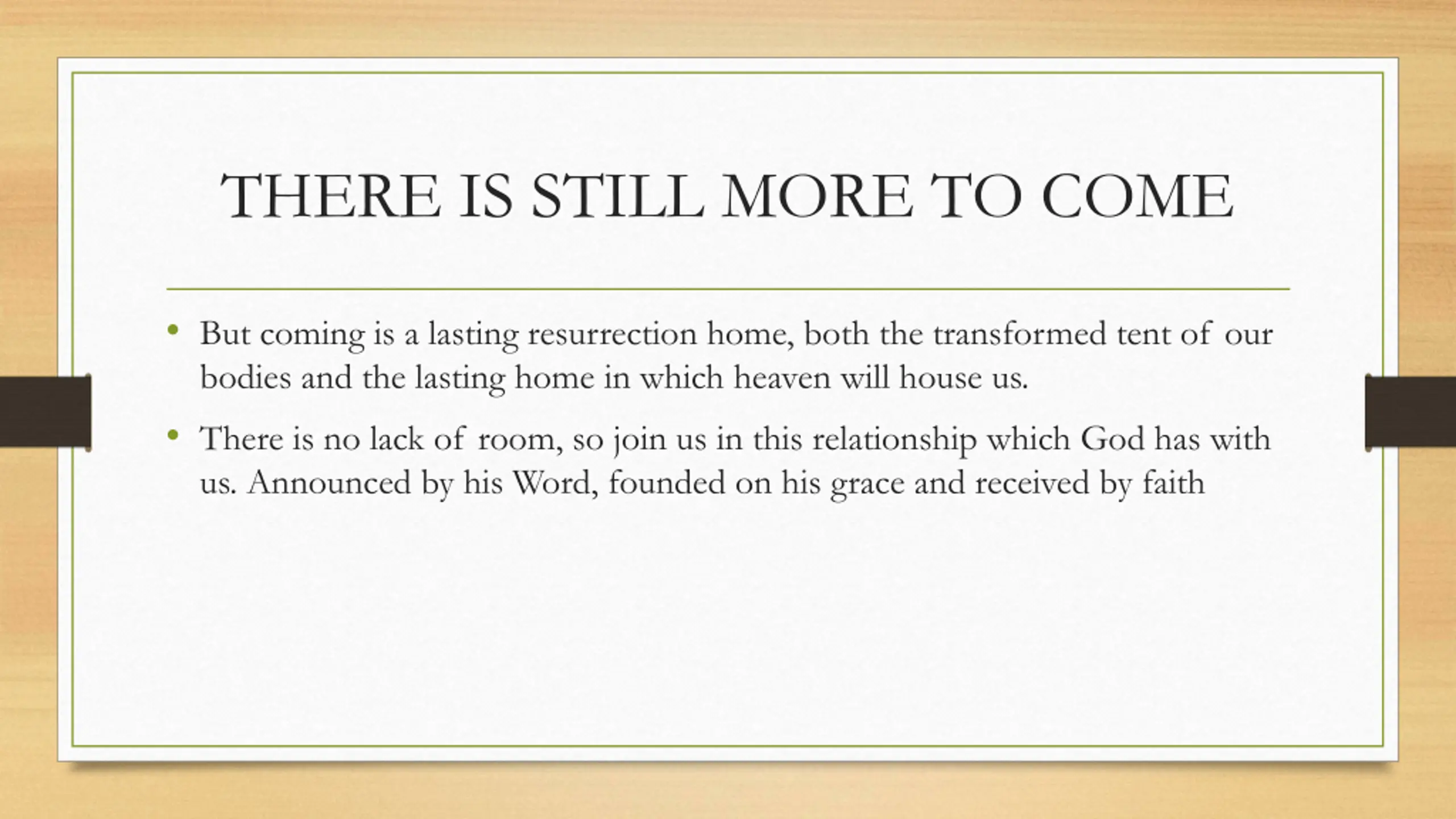 THERE IS STILL MORE TO COME But coming is a lasting resurrection home, both the transformed tent of our bodies and the lasting home in which heaven will house us. There is no lack of room, so join us in this relationship which God has with us. Announced by his Word, founded on his grace and received by faith