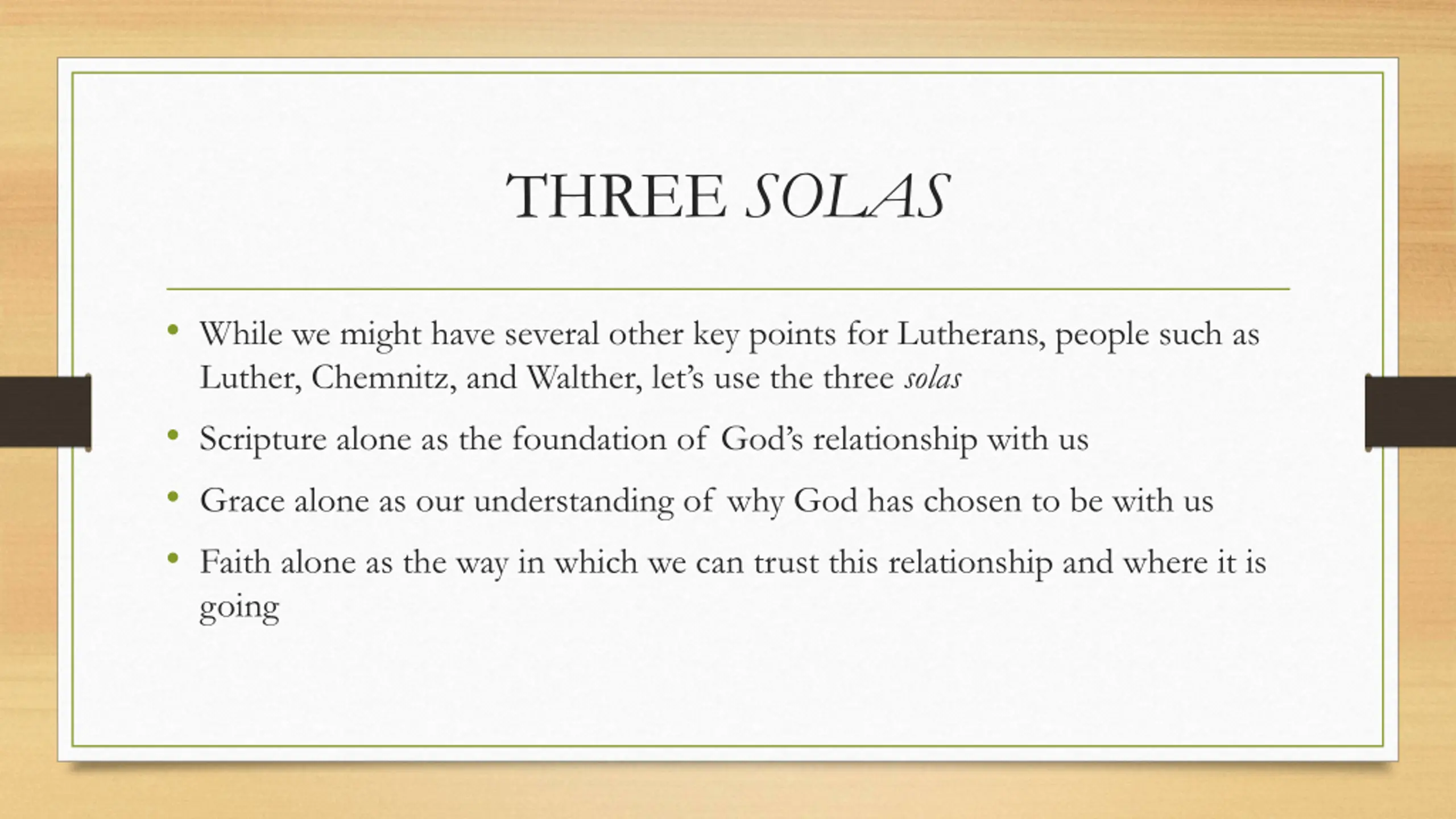 THREE SOLAS While we might have several other key points for Lutherans, people such as Luther, Chemnitz, and Walther, let s use the three solas Scripture alone as the foundation of God s relationship with us Grace alone as our understanding of why God has chosen to be with us Faith alone as the way in which we can trust this relationship and where it is going