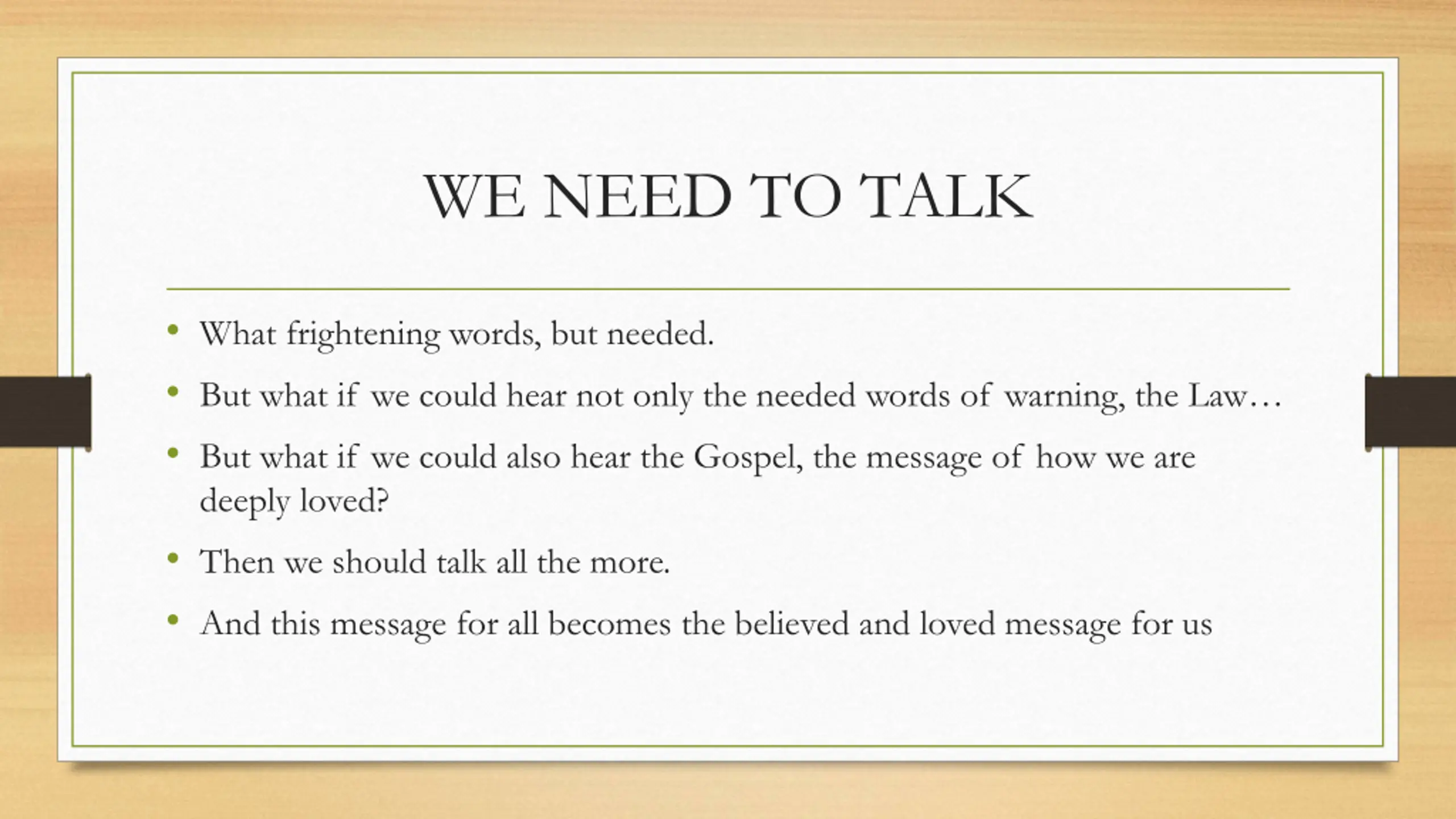 WE NEED TO TALK What frightening words, but needed. But what if we could hear not only the needed words of warning, the Law But what if we could also hear the Gospel, the message of how we are deeply loved? Then we should talk all the more. And this message for all becomes the believed and loved message for us