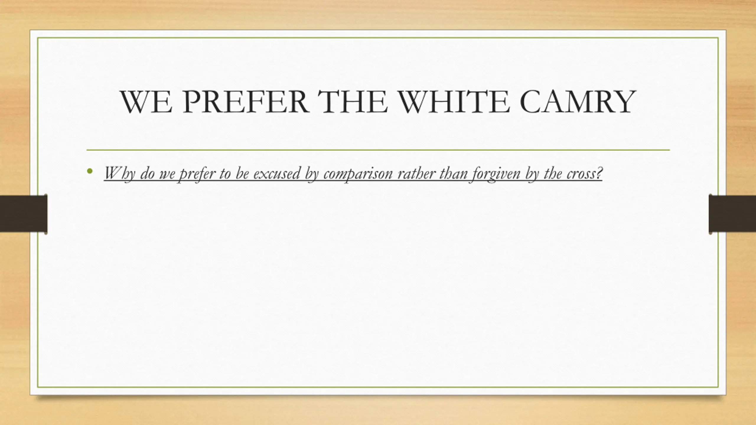 WE PREFER THE WHITE CAMRY Why do we prefer to be excused by comparison rather than forgiven by the cross?