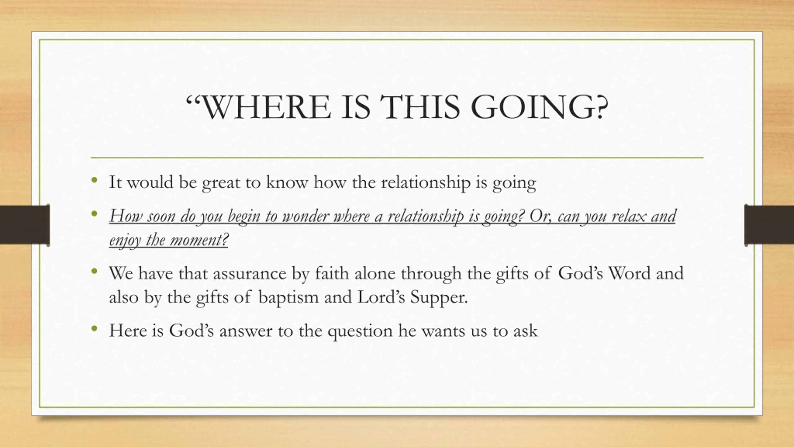 WHERE IS THIS GOING? It would be great to know how the relationship is going How soon do you begin to wonder where a relationship is going? Or, can you relax and enjoy the moment? We have that assurance by faith alone through the gifts of God s Word and also by the gifts of baptism and Lord s Supper. Here is God s answer to the question he wants us to ask