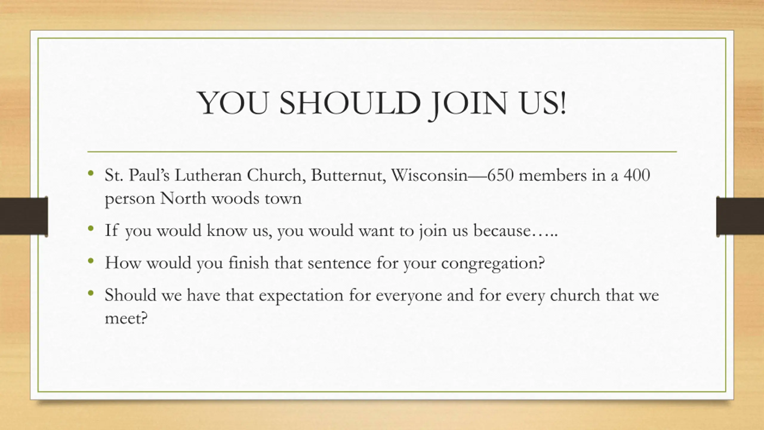 YOU SHOULD JOIN US! St. Paul s Lutheran Church, Butternut, Wisconsin 650 members in a 400 person North woods town If you would know us, you would want to join us because .. How would you finish that sentence for your congregation? Should we have that expectation for everyone and for every church that we meet?