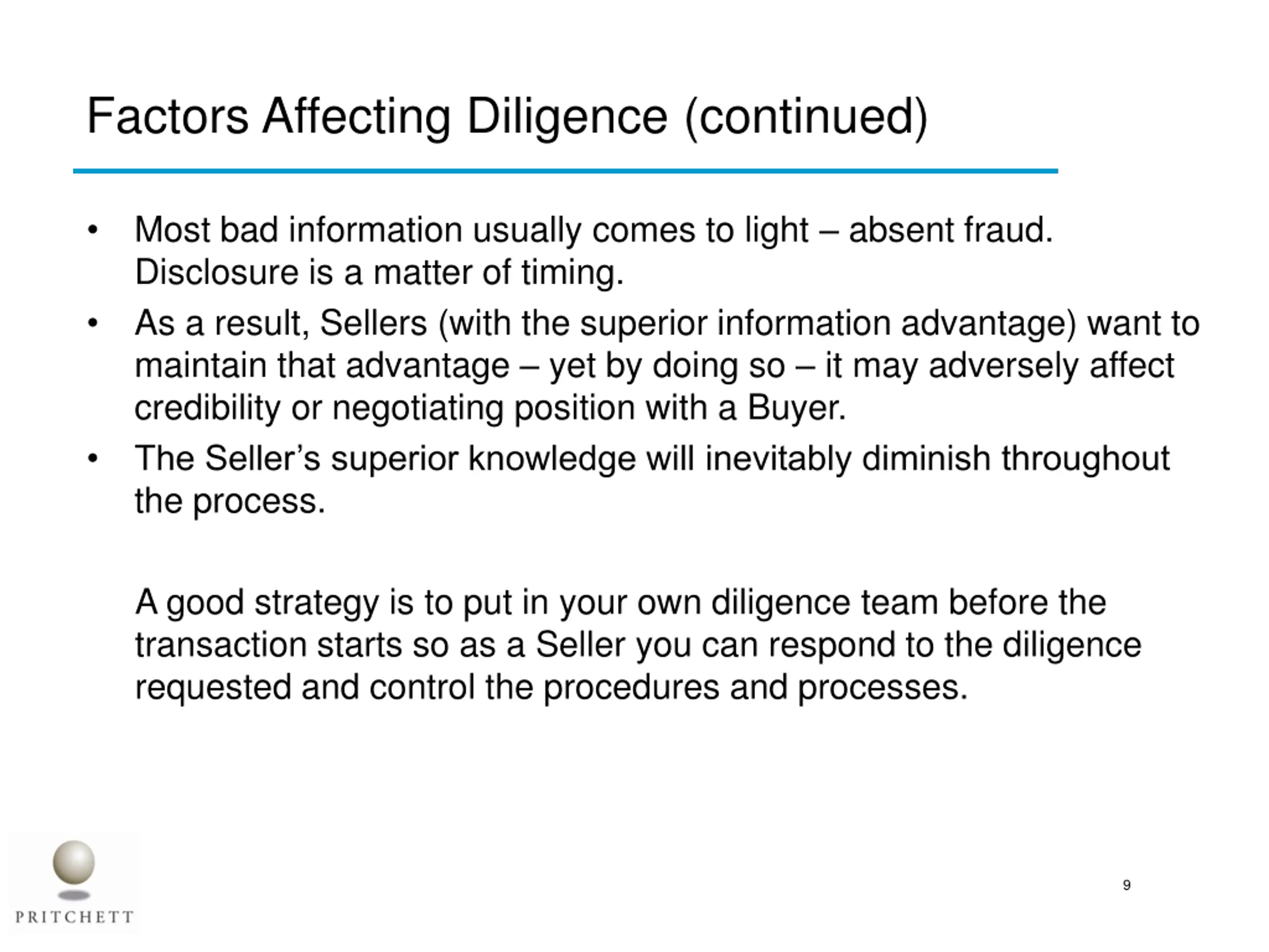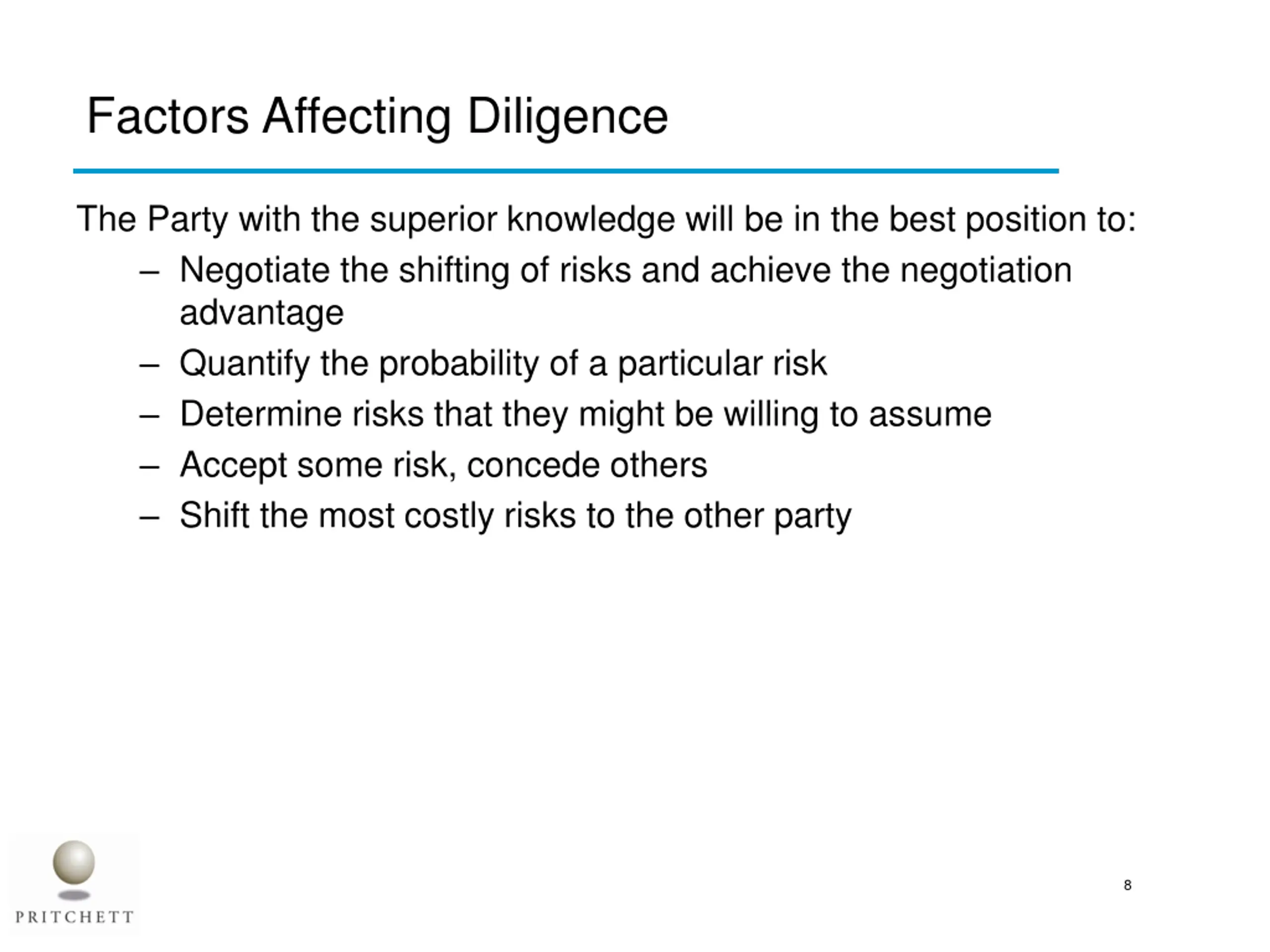 Factors Affecting Diligence The Party with the superior knowledge will be in the best position to: Negotiate the shifting of risks and achieve the negotiation advantage Quantify the probability of a particular risk Determine risks that they might be willing to assume Accept some risk, concede others Shift the most costly risks to the other party 8