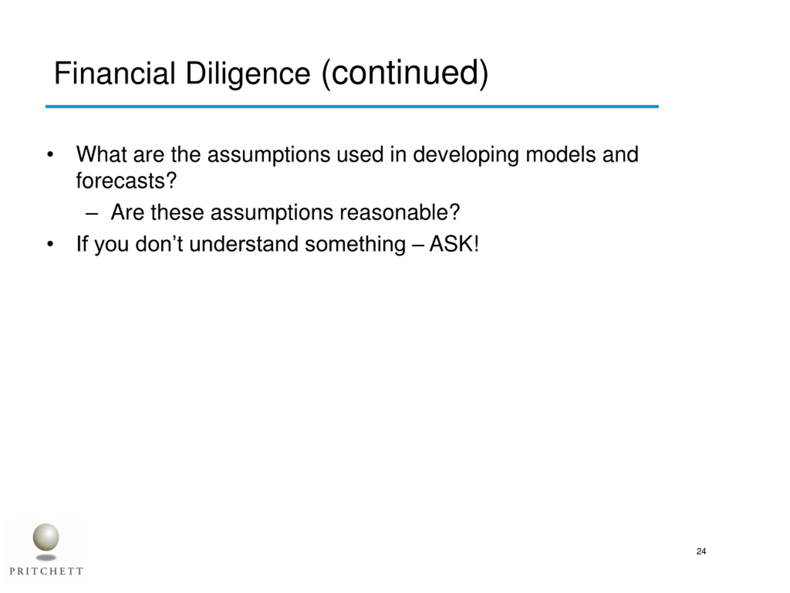 Financial Diligence (continued) What are the assumptions used in developing models and forecasts? Are these assumptions reasonable? If you don t understand something ASK! 24