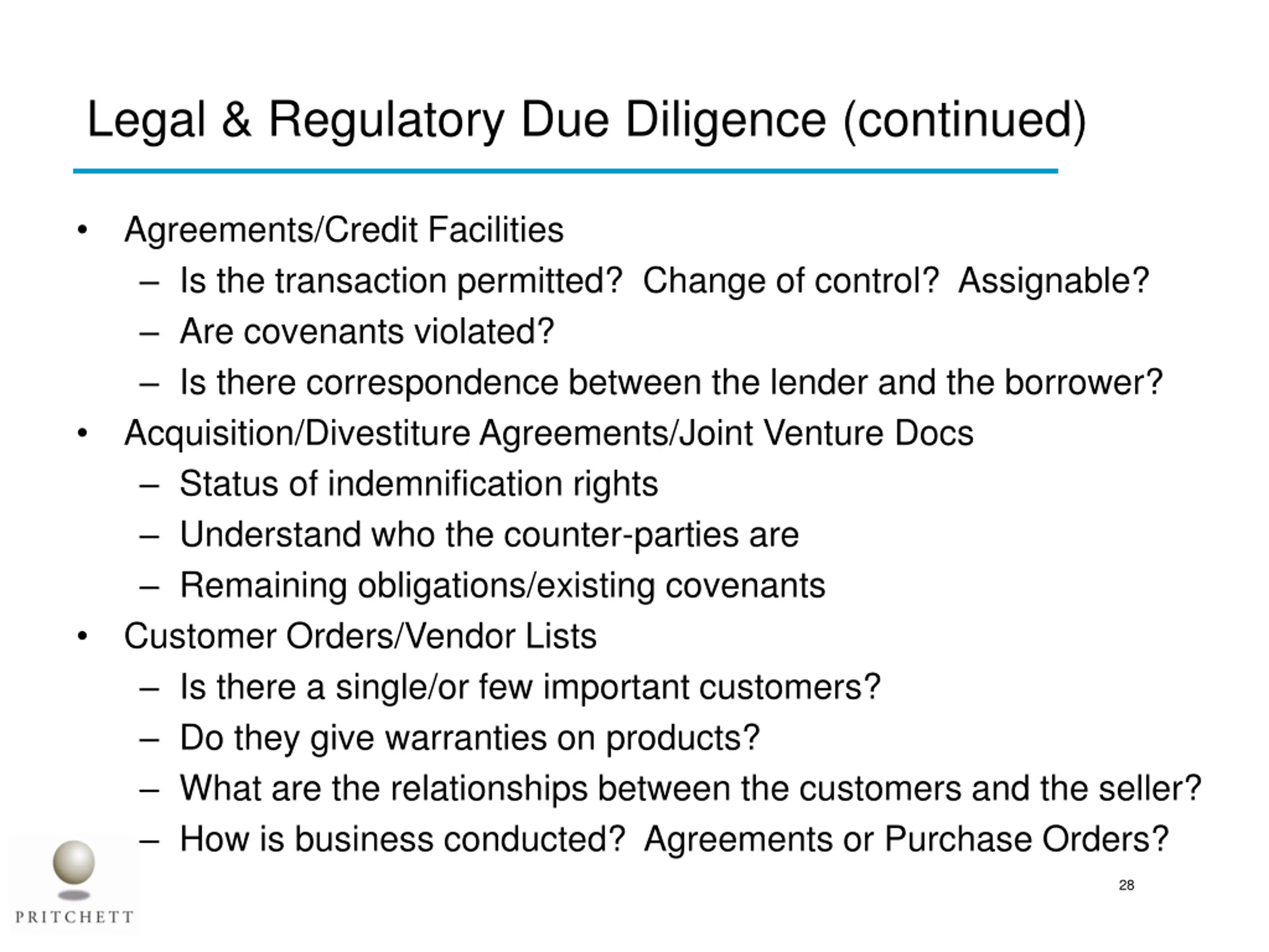 Legal & Regulatory Due Diligence Impacted areas: Litigation, Environmental, Employment, Intellectual Property, Tax/ERISA (Benefits), FCPA, Insurance A little help from your friends . This work will be the basis for review and modification of representations and warranties and the preparation of Disclosure Schedules. Analysis of legal liabilities and contingencies. 27