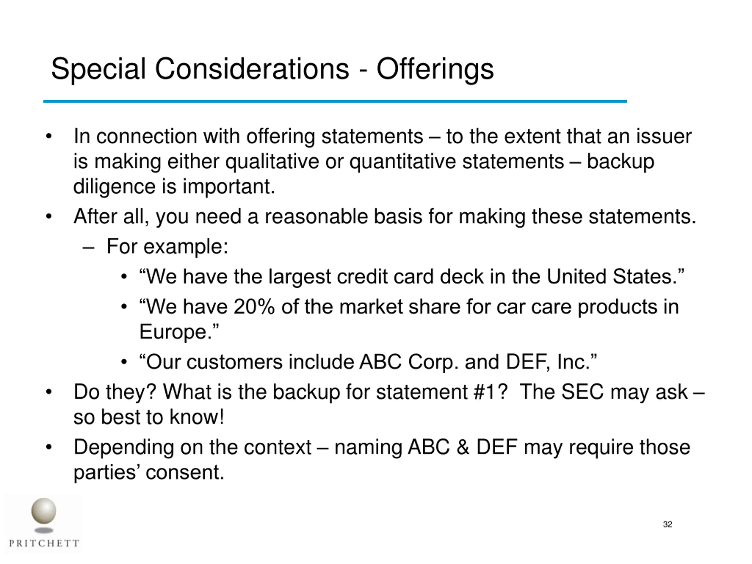 Special Considerations - Offerings In connection with offering statements to the extent that an issuer is making either qualitative or quantitative statements backup diligence is important. After all, you need a reasonable basis for making these statements. For example: We have the largest credit card deck in the United States. We have 20% of the market share for car care products in Europe. Our customers include ABC Corp. and DEF, Inc. Do they? What is the backup for statement #1? The SEC may ask so best to know! Depending on the context naming ABC & DEF may require those parties consent. 32